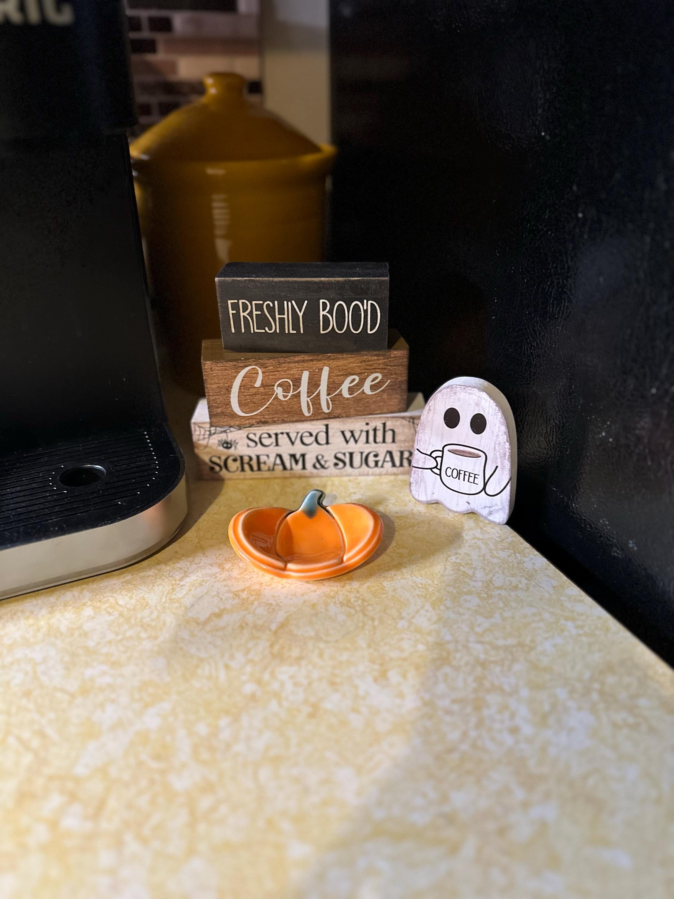 Our pumpkin teaspoon rest is perfect for home Halloween coffee station decor. It is a handmade ceramic bright orange pumpkin that will look adorable at the Thanksgiving table.