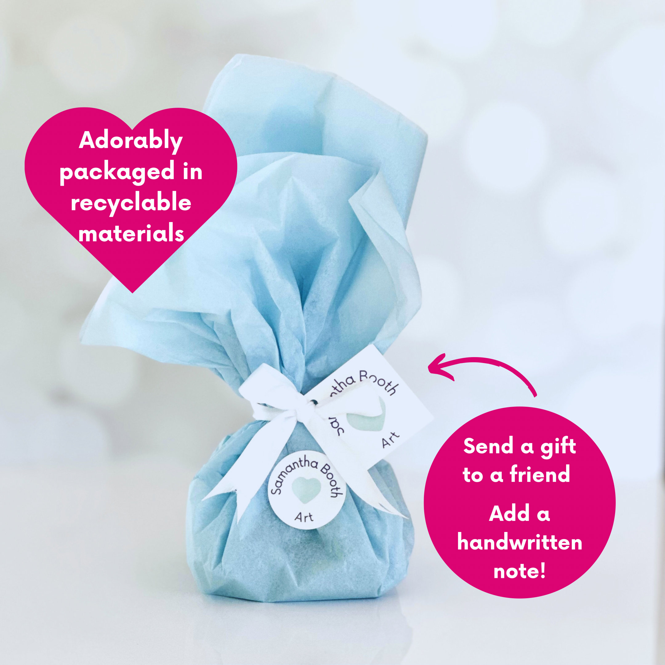 Each piece comes nicely wrapped in colorful tissue paper. If something is a gift, please let me know what you would like written on an enclosed card.