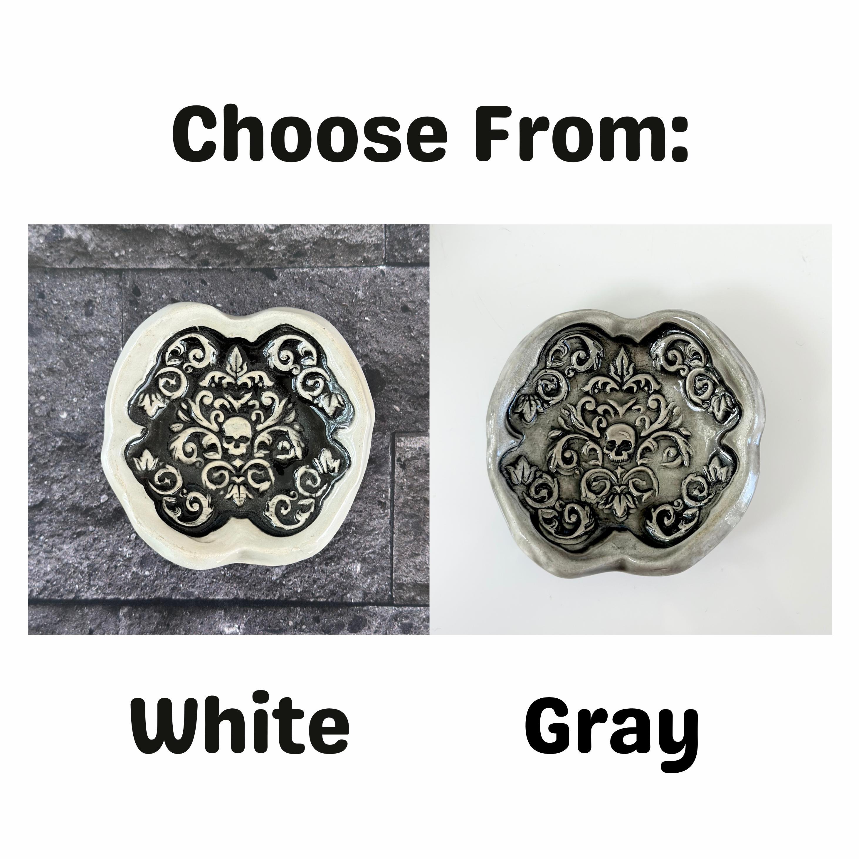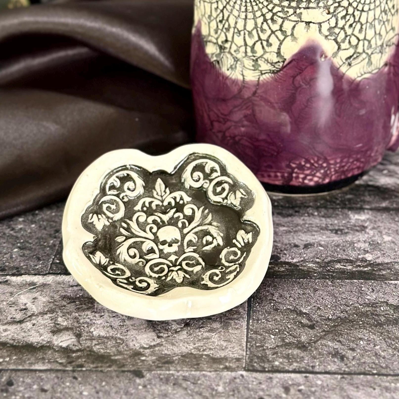 Our gothic skull spoon rest is perfect for a spooky halloween home coffee bar station. A ceramic skull teaspoon holder for goth kitchen decor or a goth coffee lover gift.