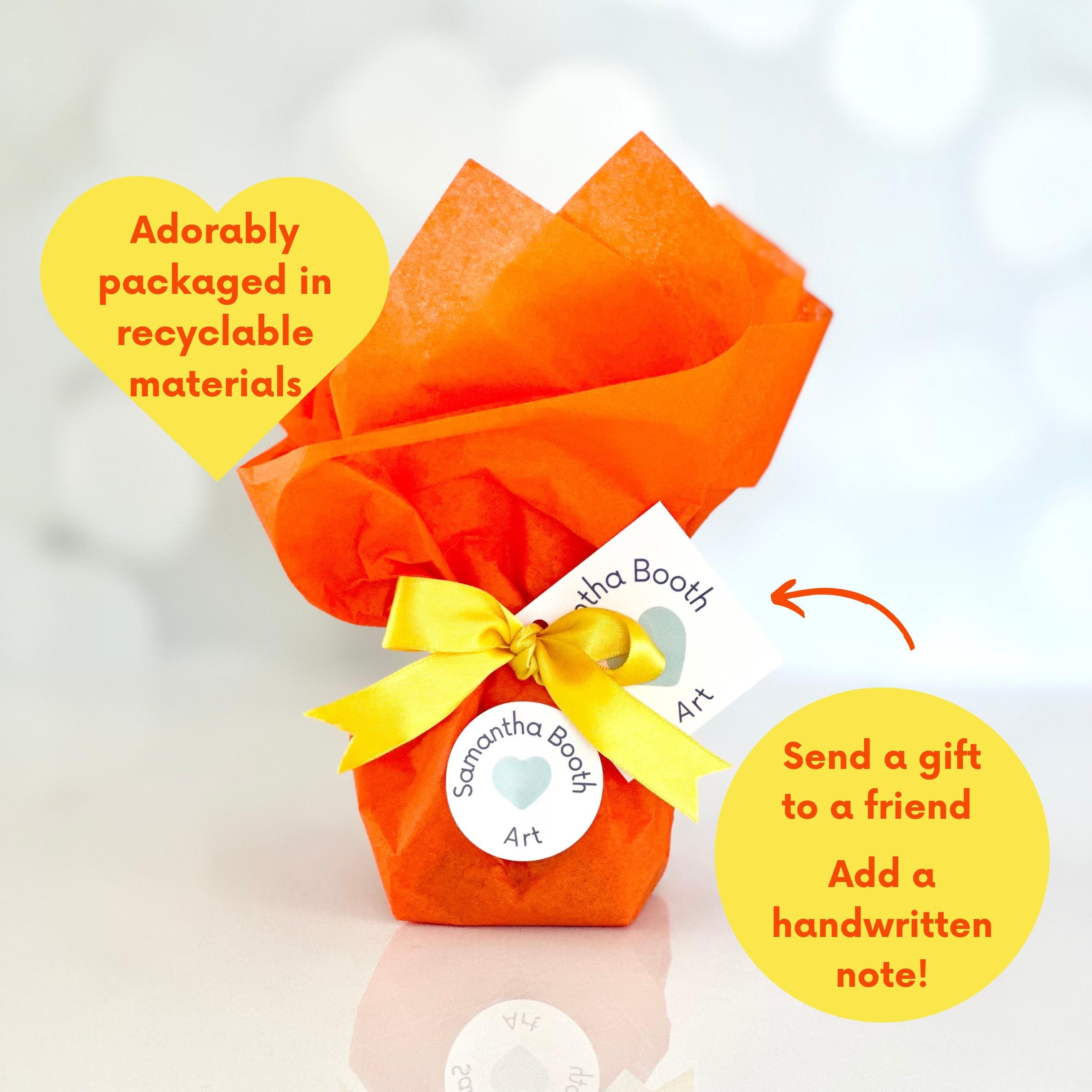 Each piece comes nicely wrapped in colorful tissue paper. If something is a gift, please let me know what you would like written on an enclosed card.