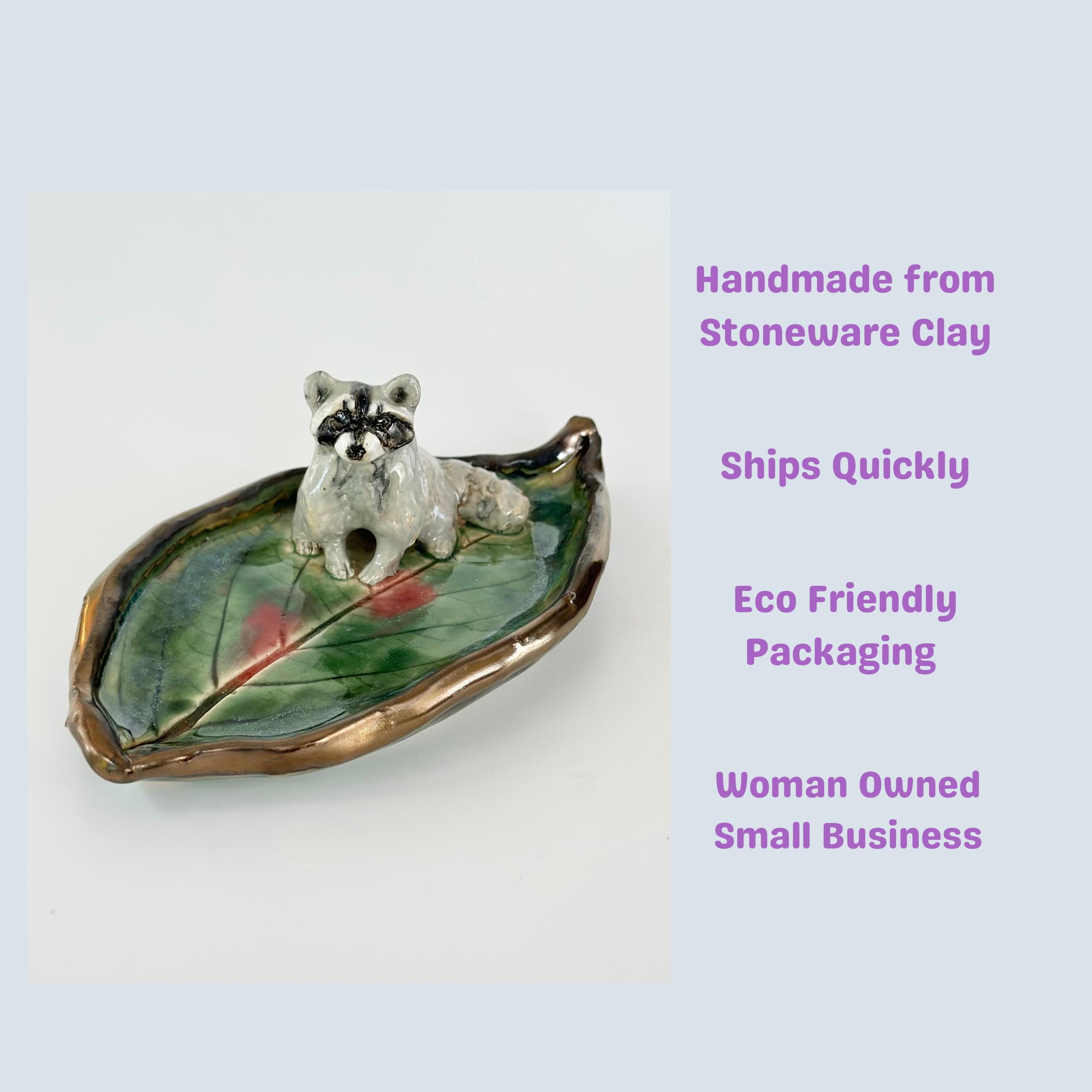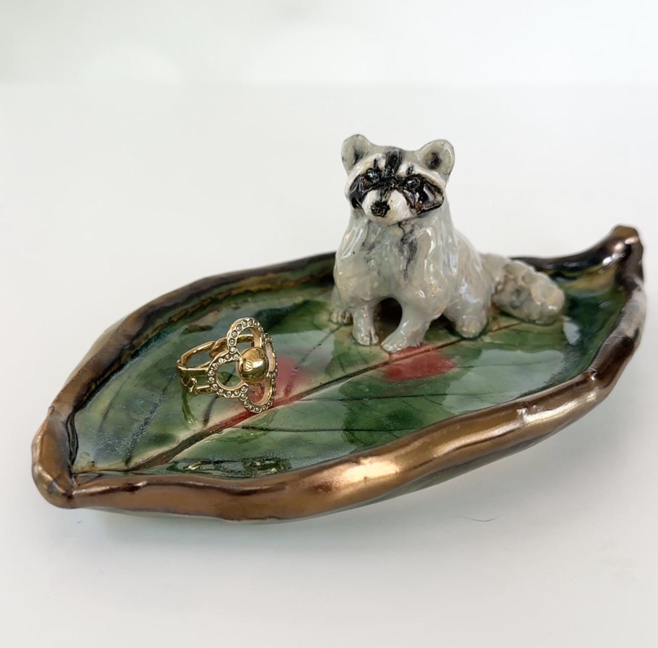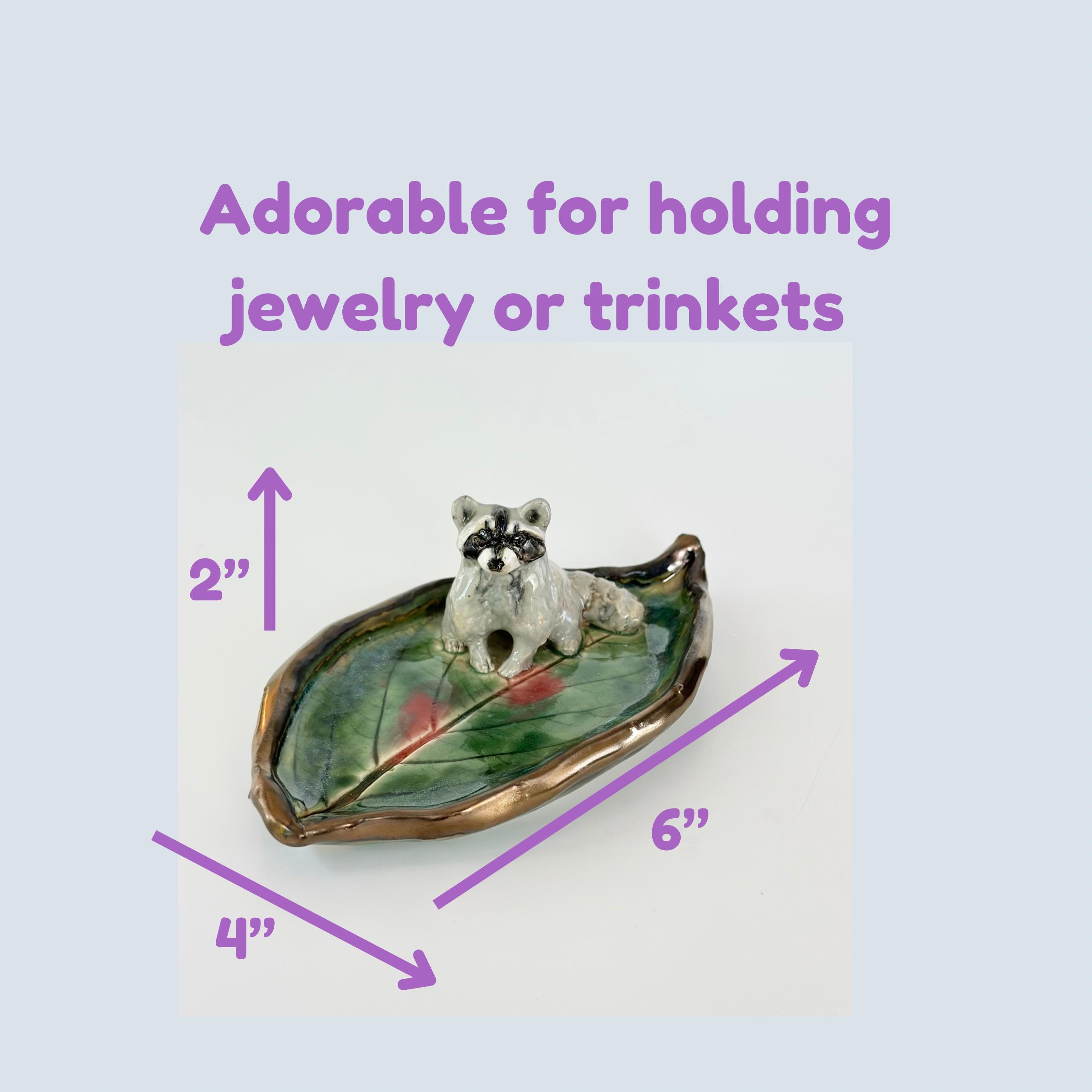 Jewelry dish raccoon art trinket dish makes a fun and functional gift. This ceramic gift raccoon jewelry holder is perfect as a daughter birthday gift, nature leaf jewelry dish, or necklace holder.