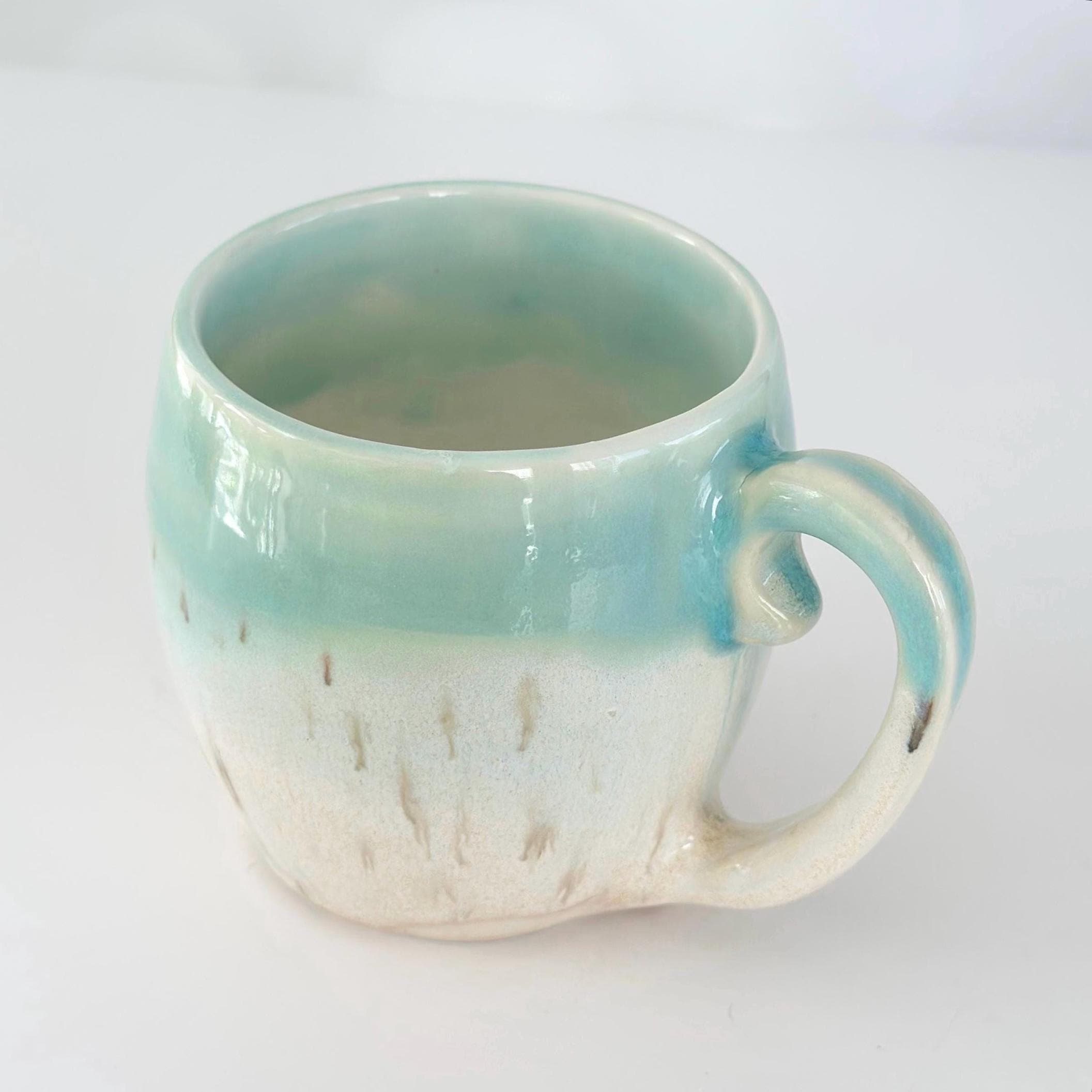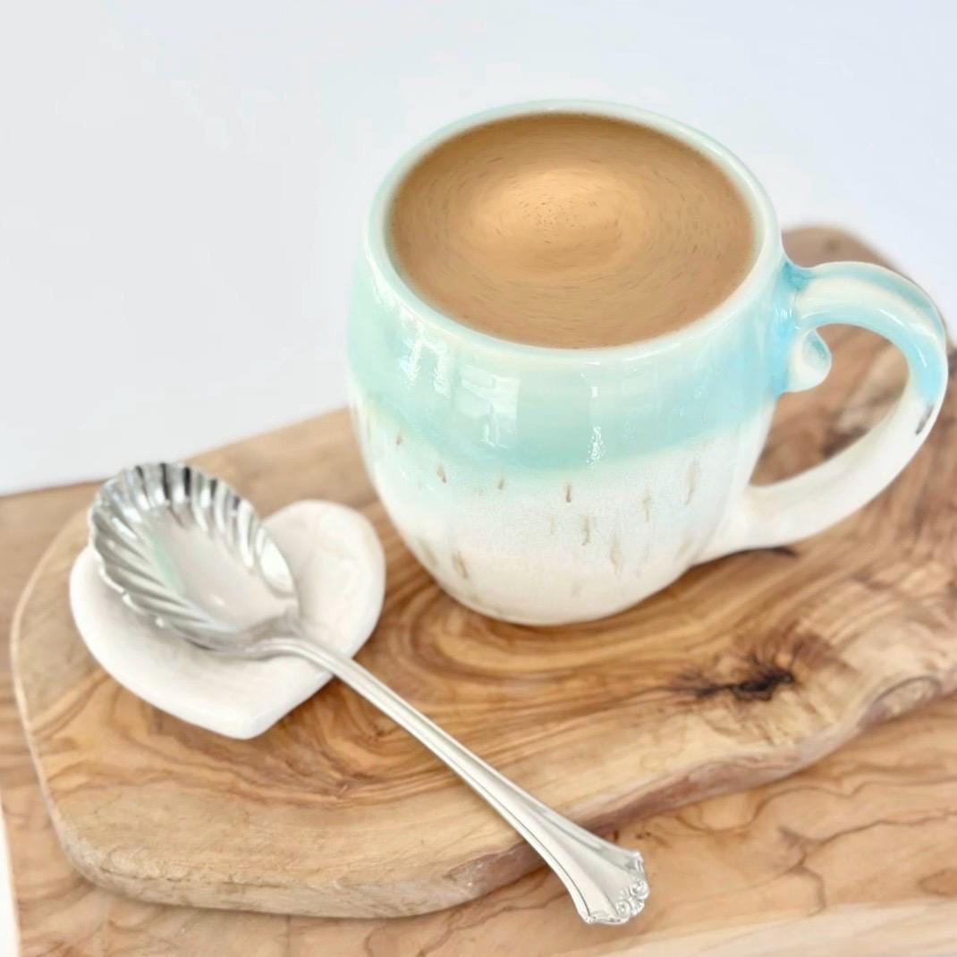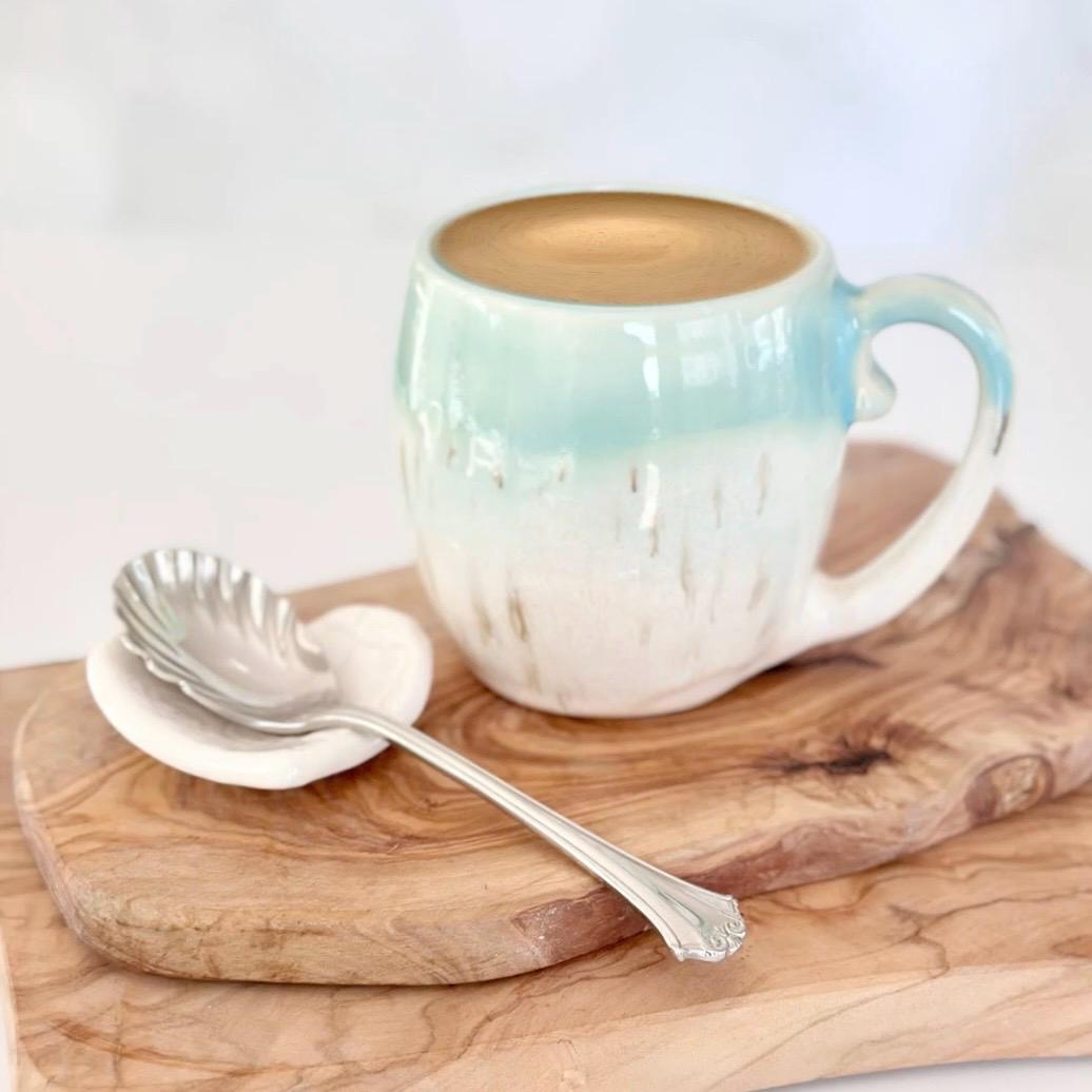 This handmade pottery mug is the perfect coffee lover gift for a coffee bar station or boho kitchen. A unique birthday coffee station gift for tea lovers or anyone who enjoys artisan mugs.