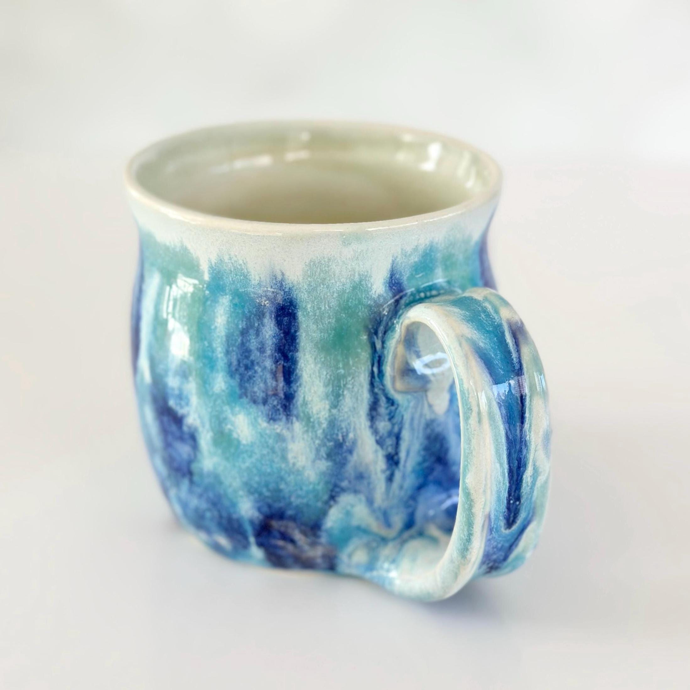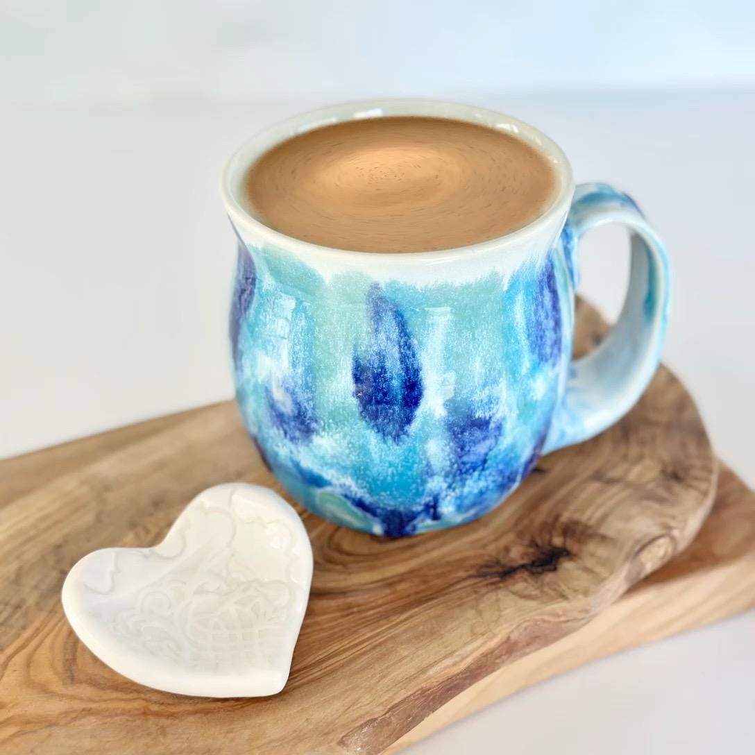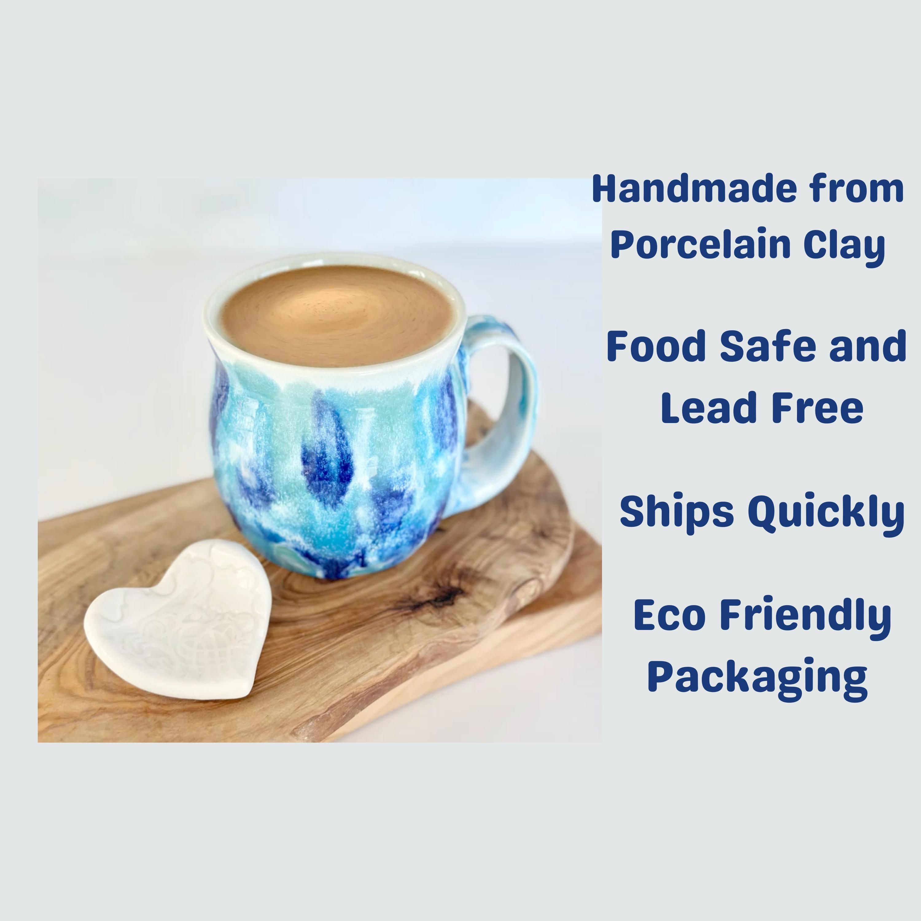 This handmade blue green pottery mug is the perfect coffee lover gift for a coffee bar station or boho kitchen. A unique birthday coffee station gift for tea lovers or anyone who enjoys artisan mugs.