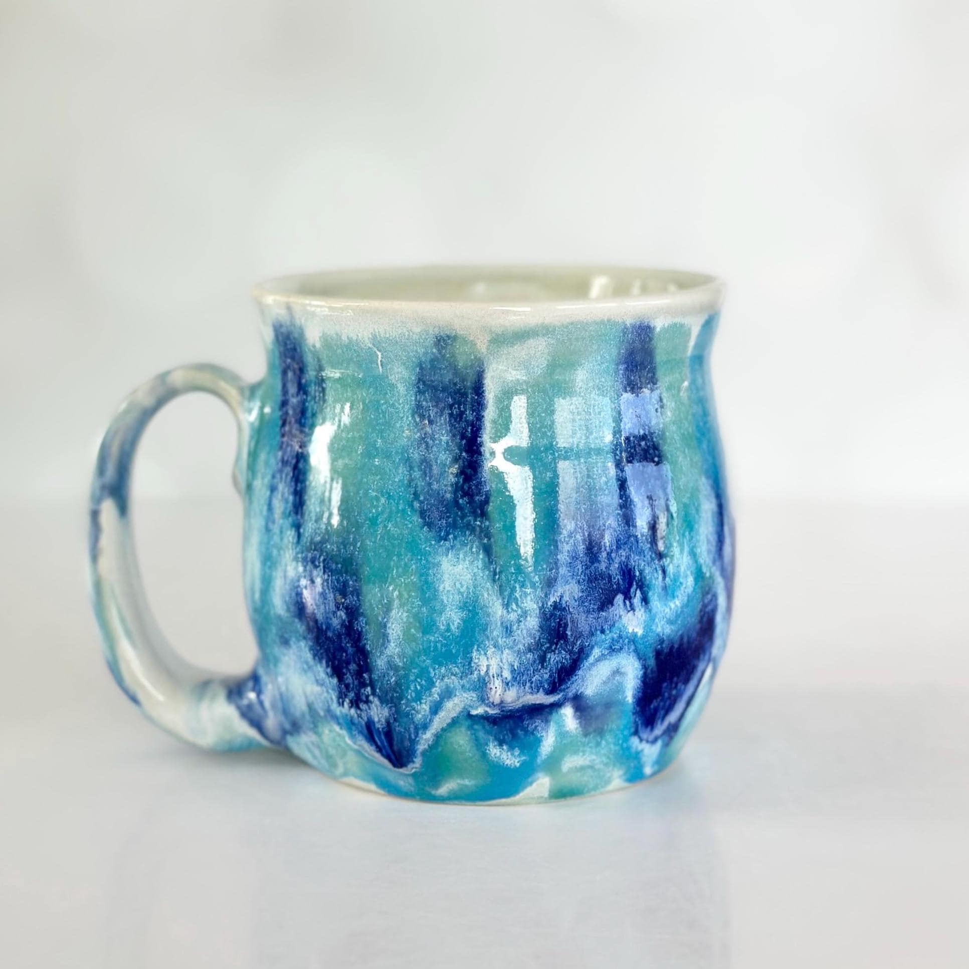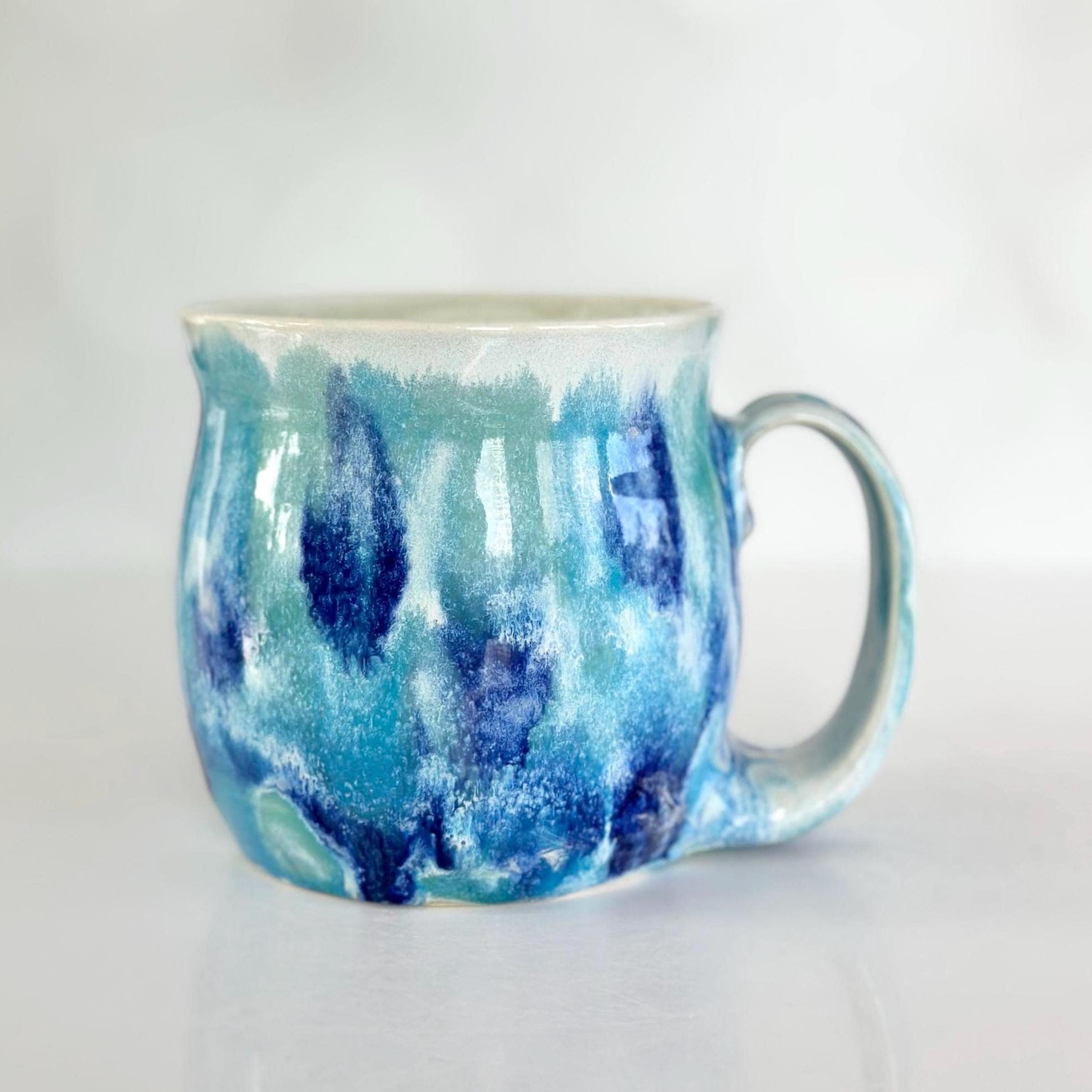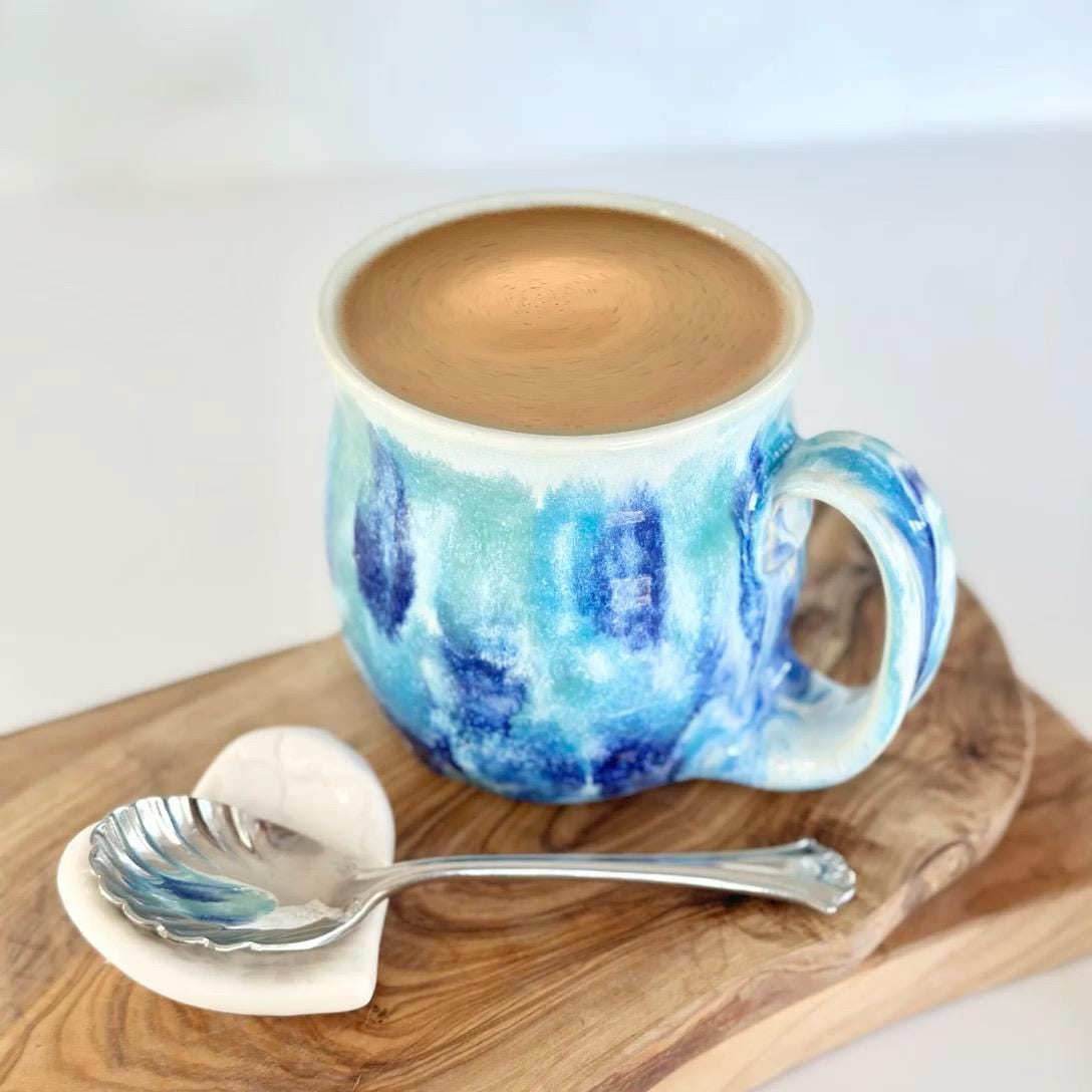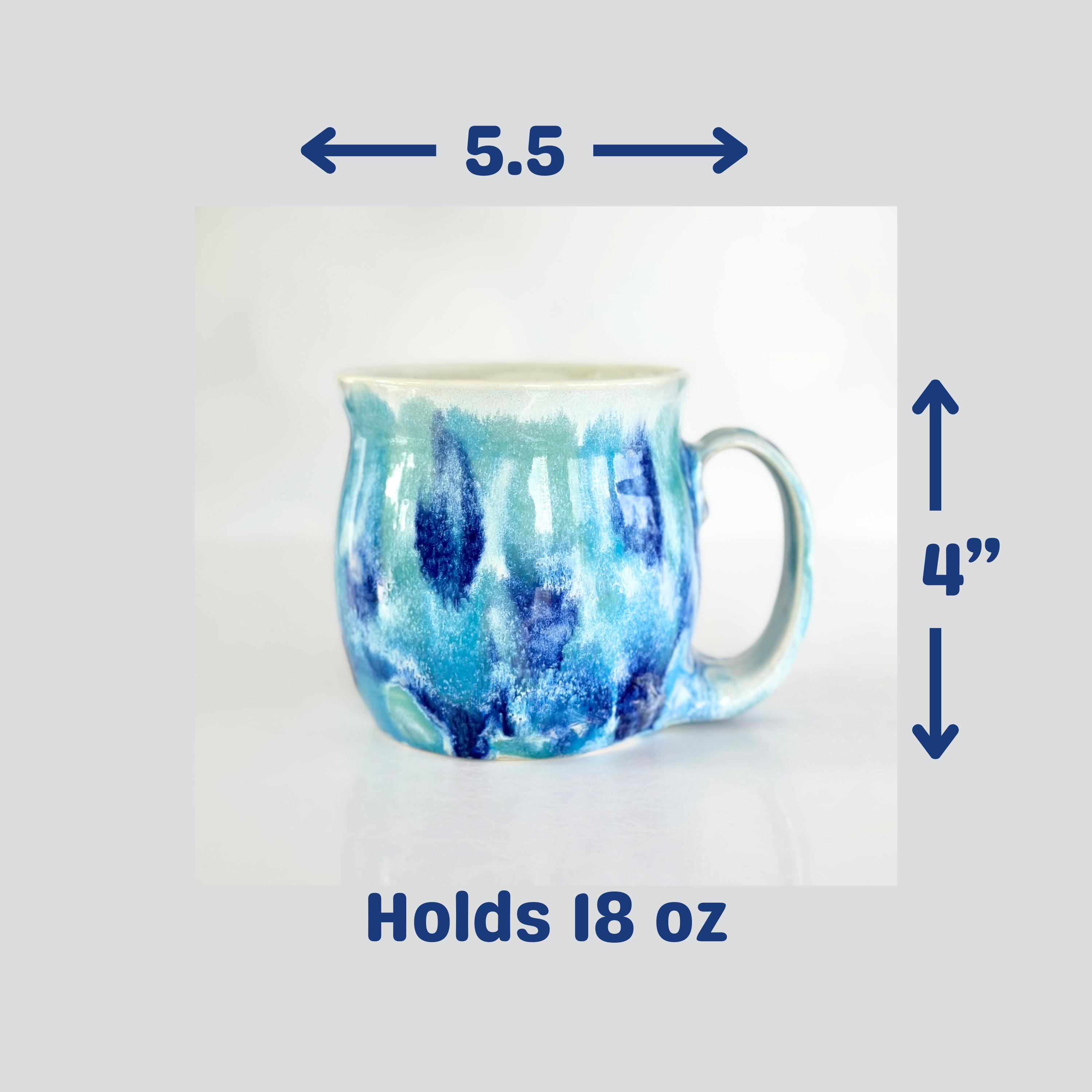 This handmade blue green pottery mug is the perfect coffee lover gift for a coffee bar station or boho kitchen. A unique birthday coffee station gift for tea lovers or anyone who enjoys artisan mugs.