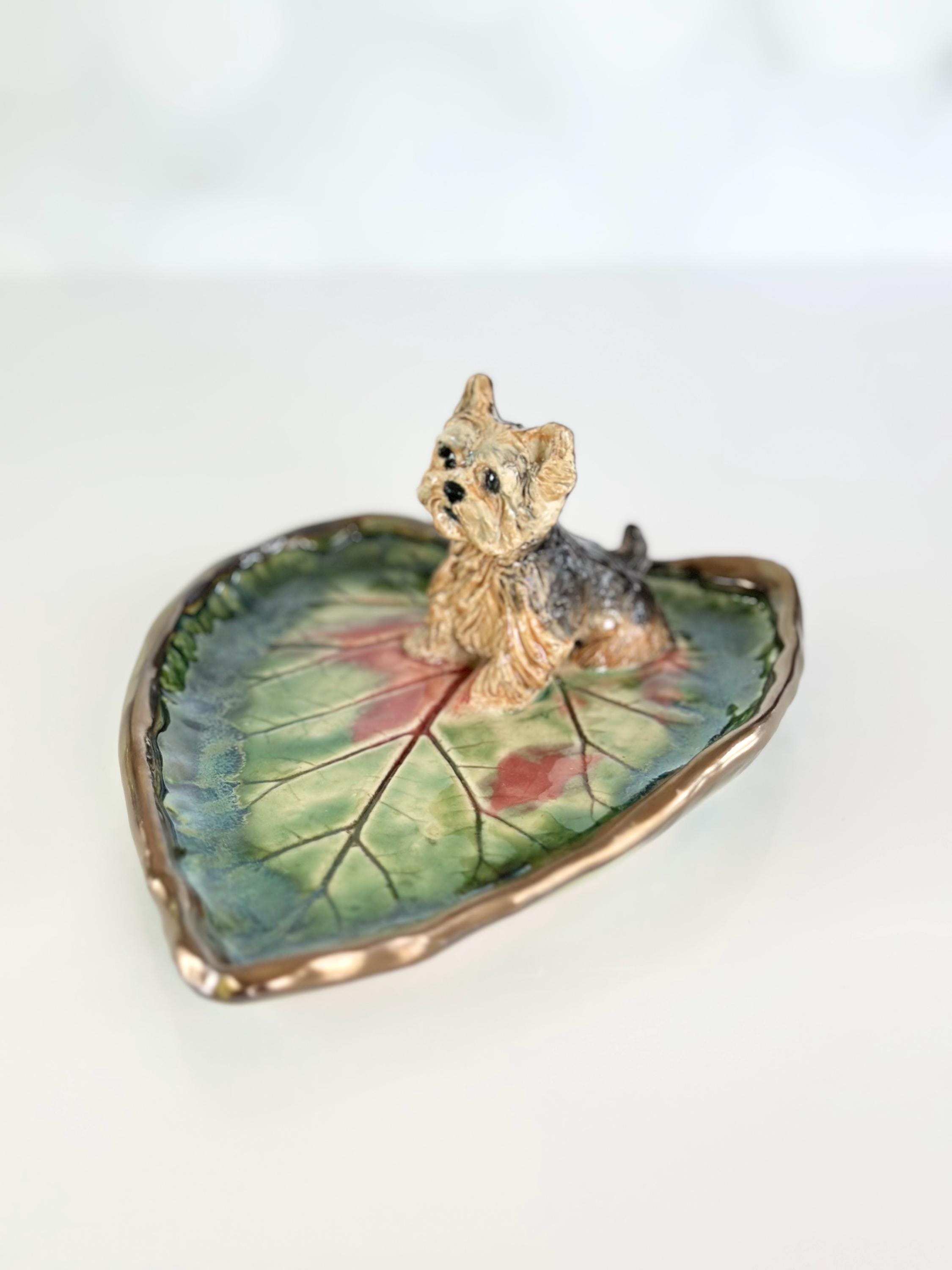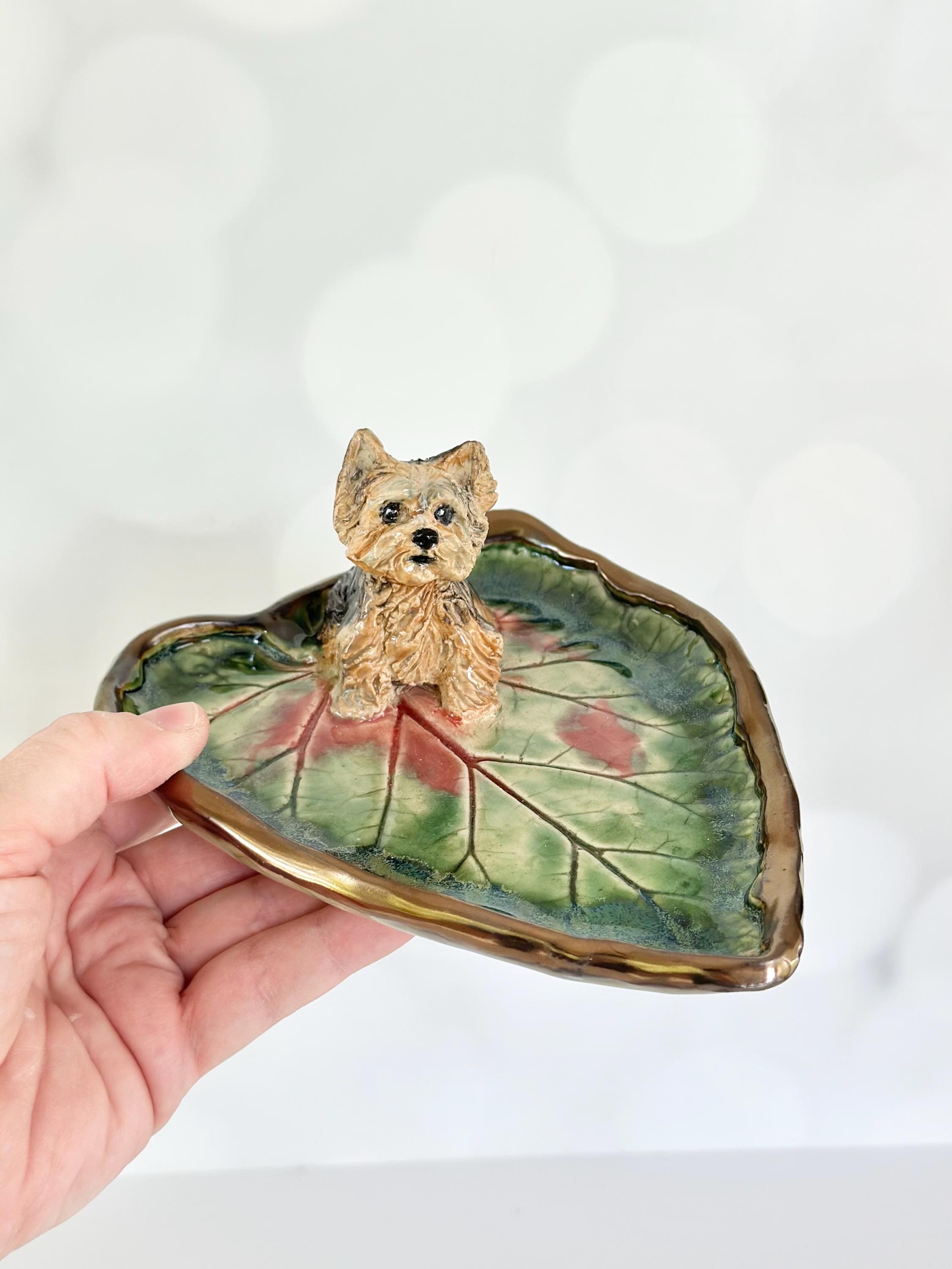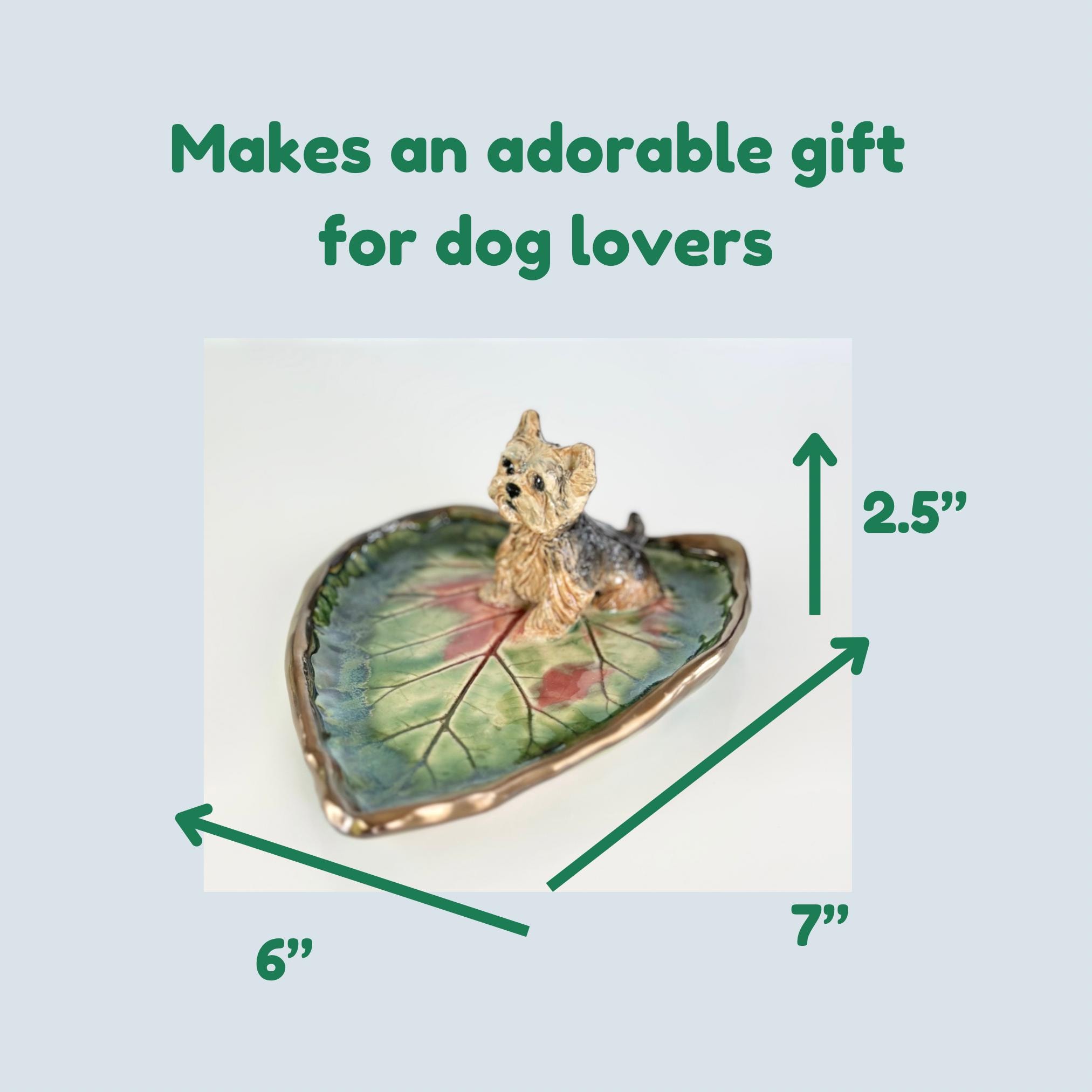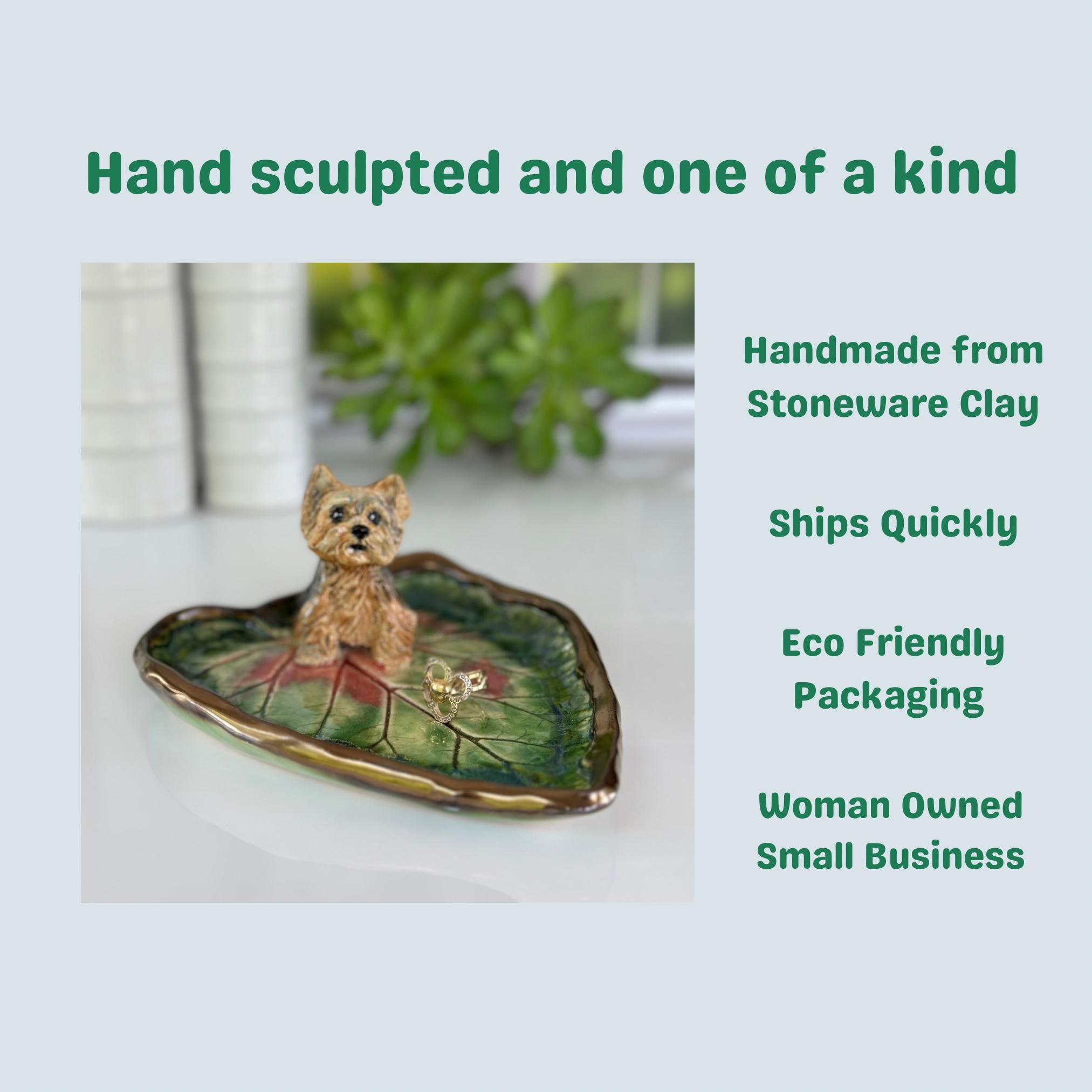 Our hand sculpted Yorkie art trinket dish makes an adorable and functional gift. This ceramic gift Yorkie jewelry holder is perfect as a Yorkie mom birthday gift, nature leaf jewelry dish, or necklace holder.