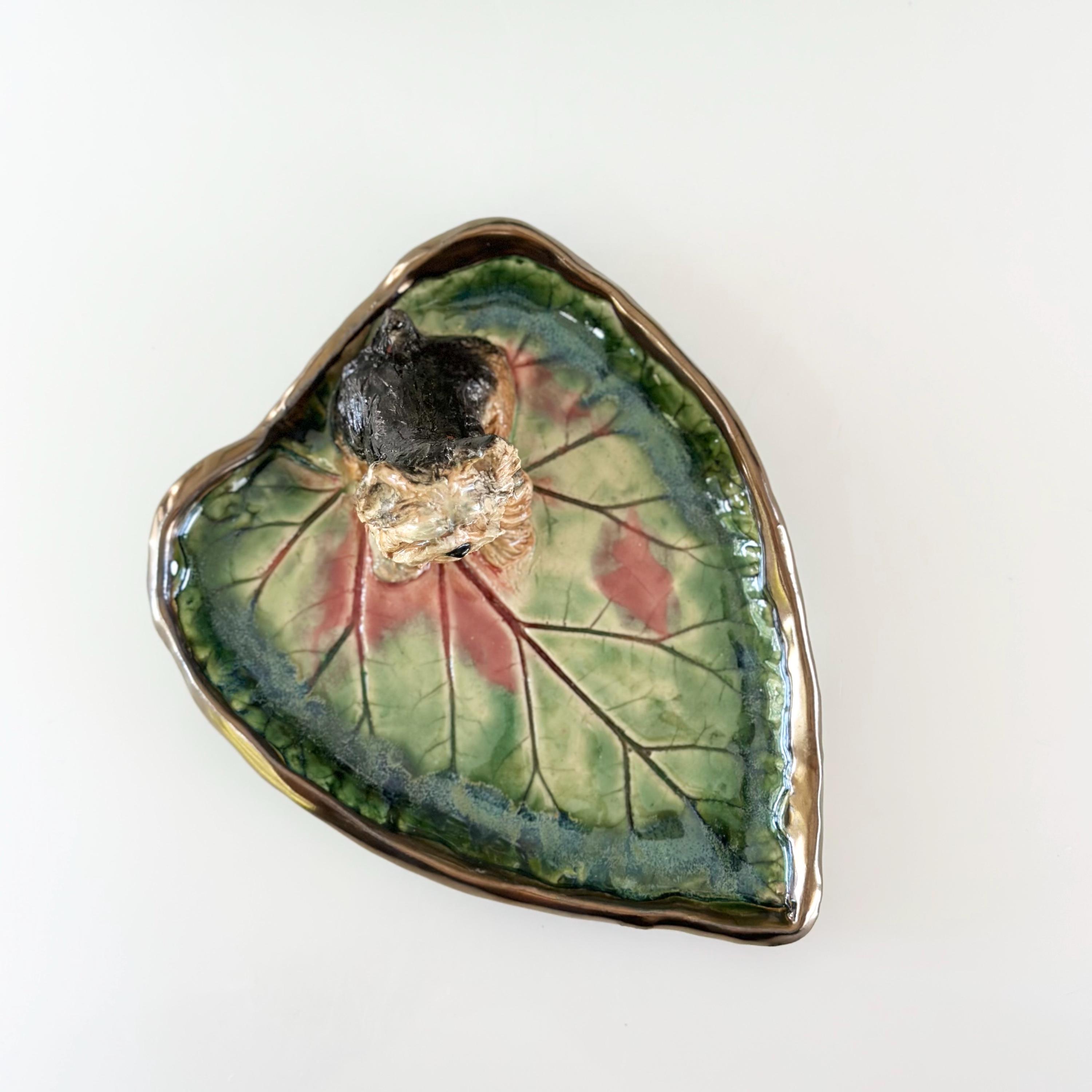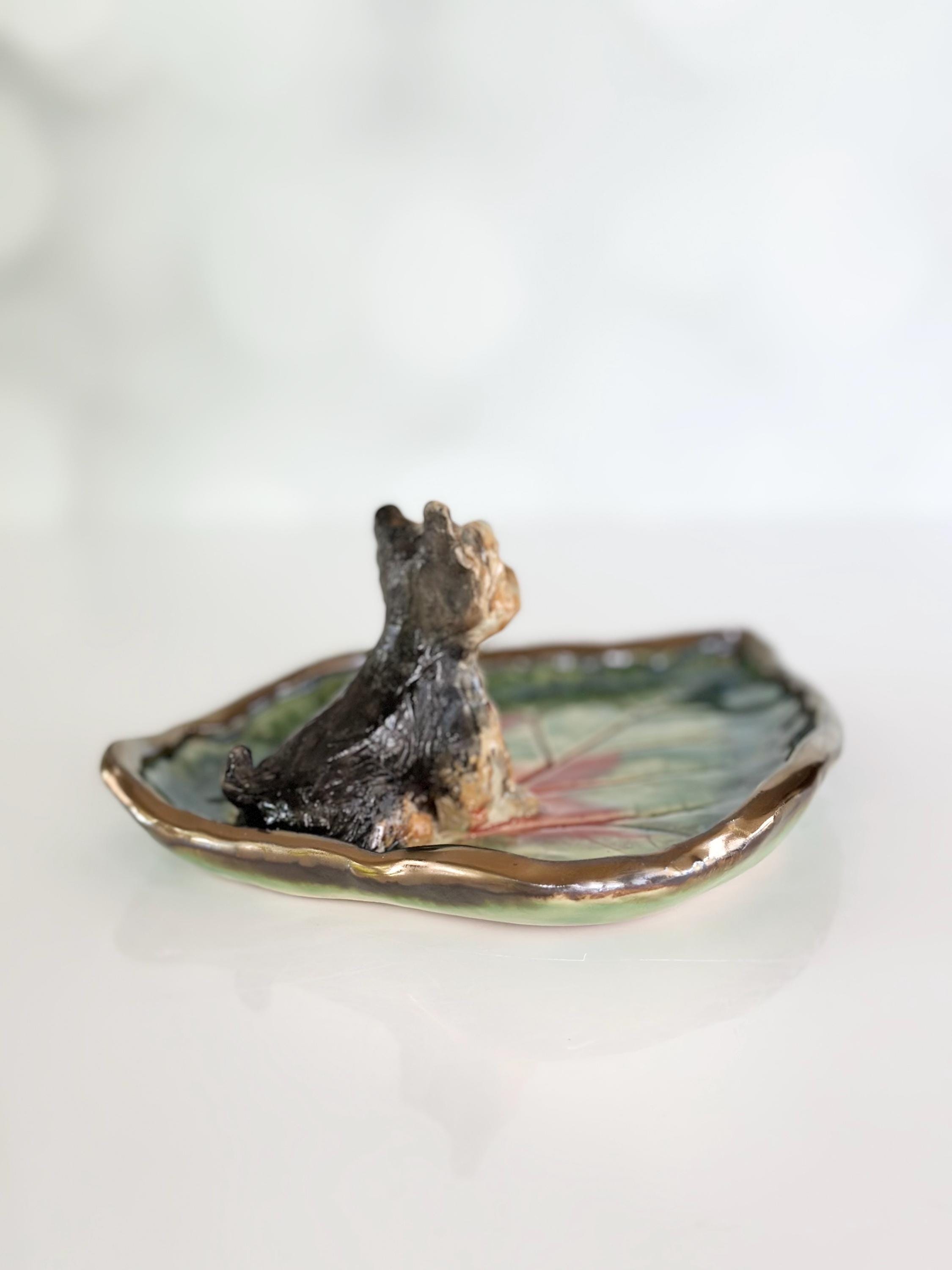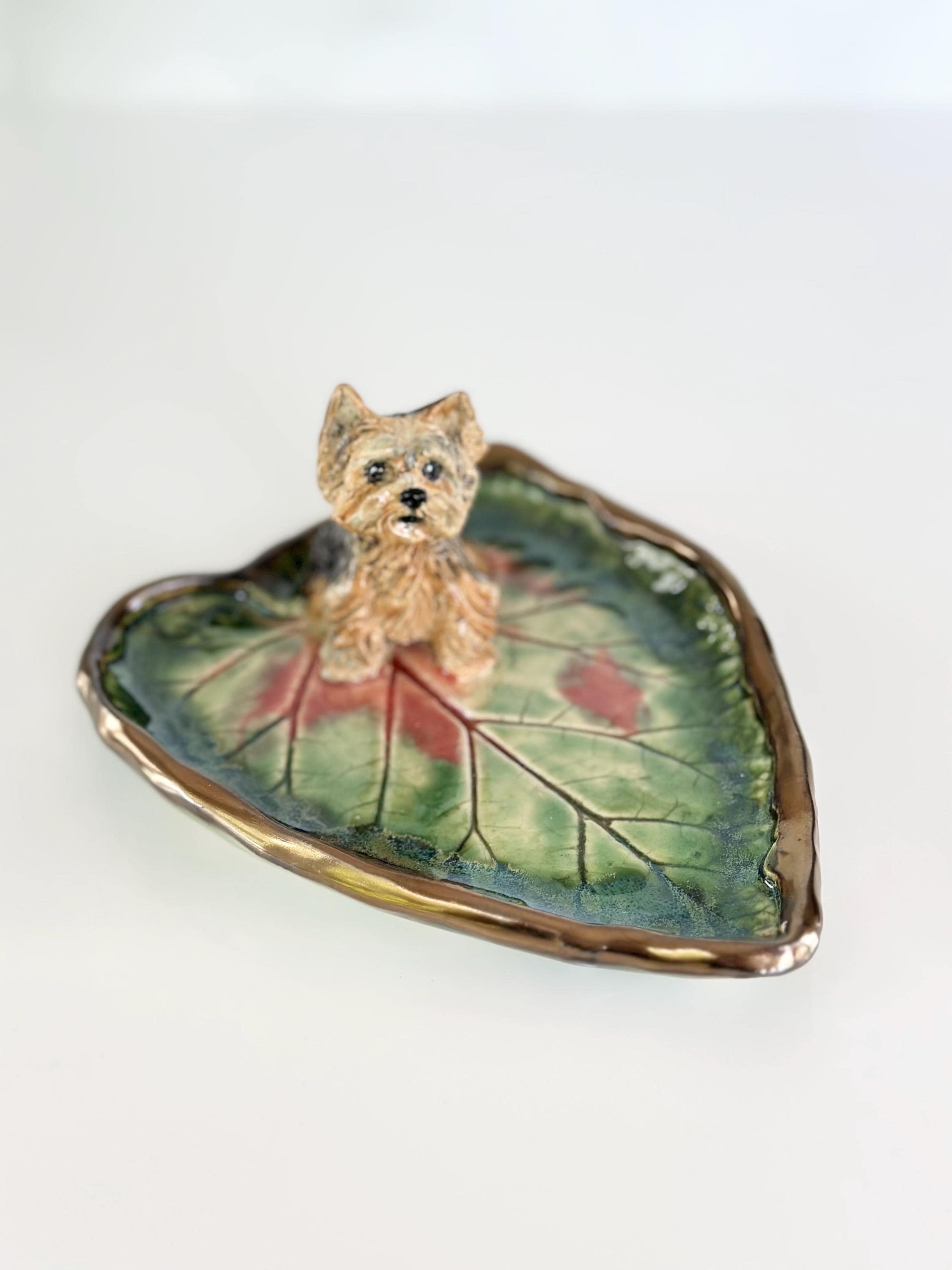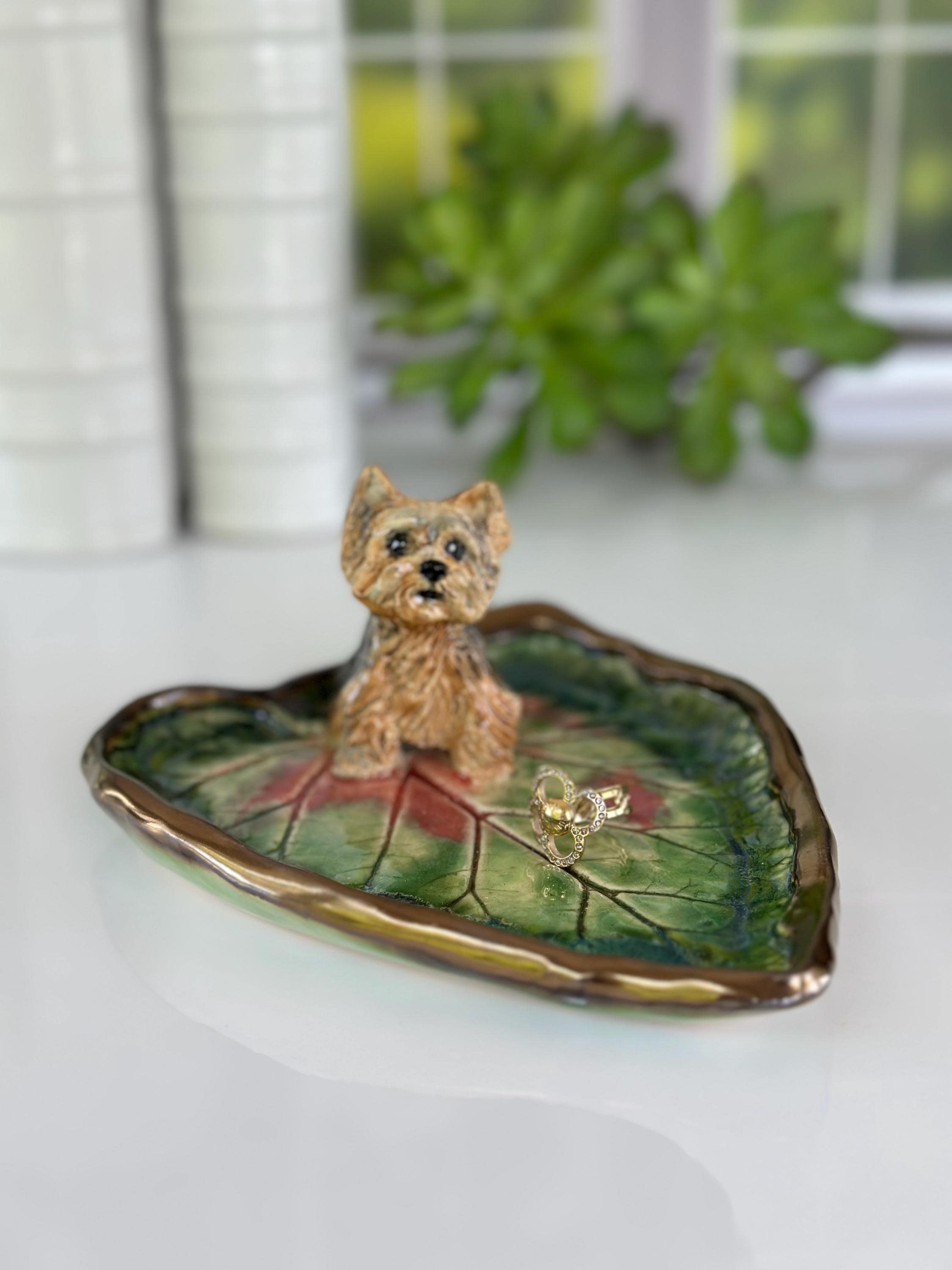 Our hand sculpted Yorkie art trinket dish makes an adorable and functional gift. This ceramic gift Yorkie jewelry holder is perfect as a Yorkie mom birthday gift, nature leaf jewelry dish, or necklace holder.