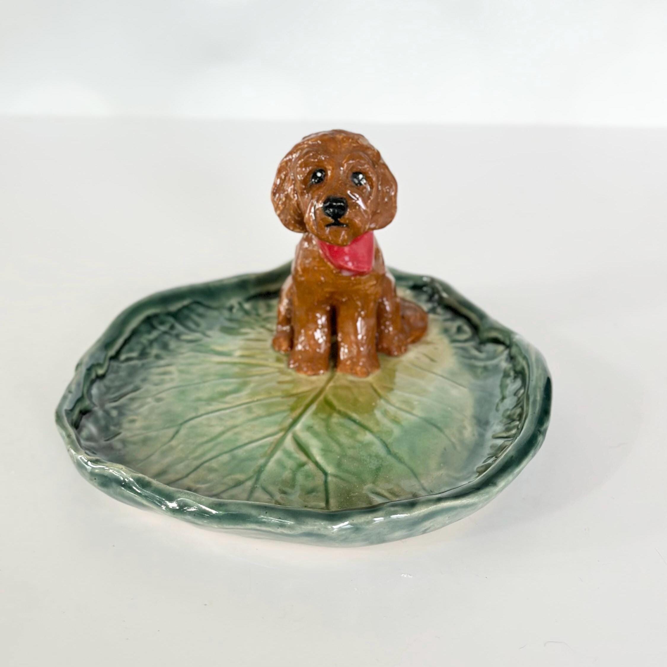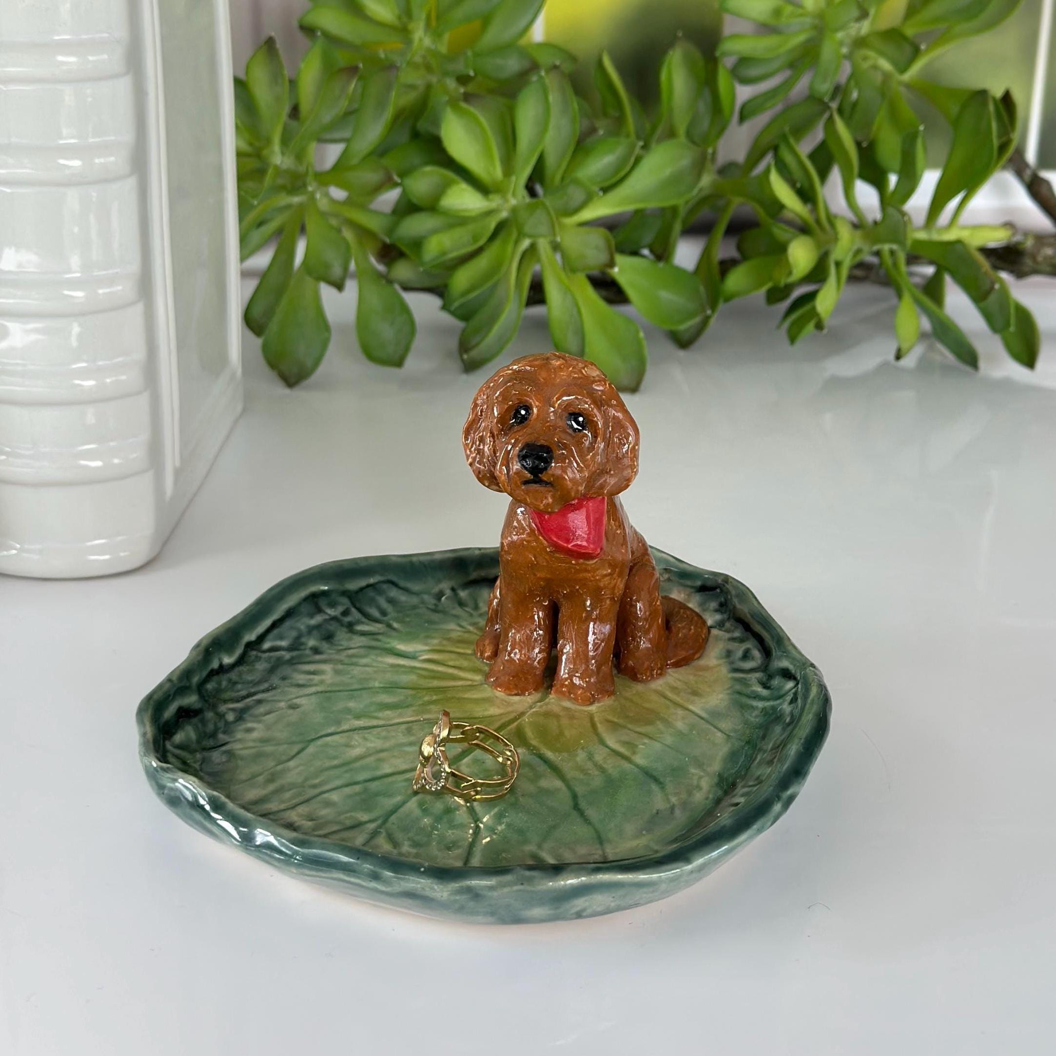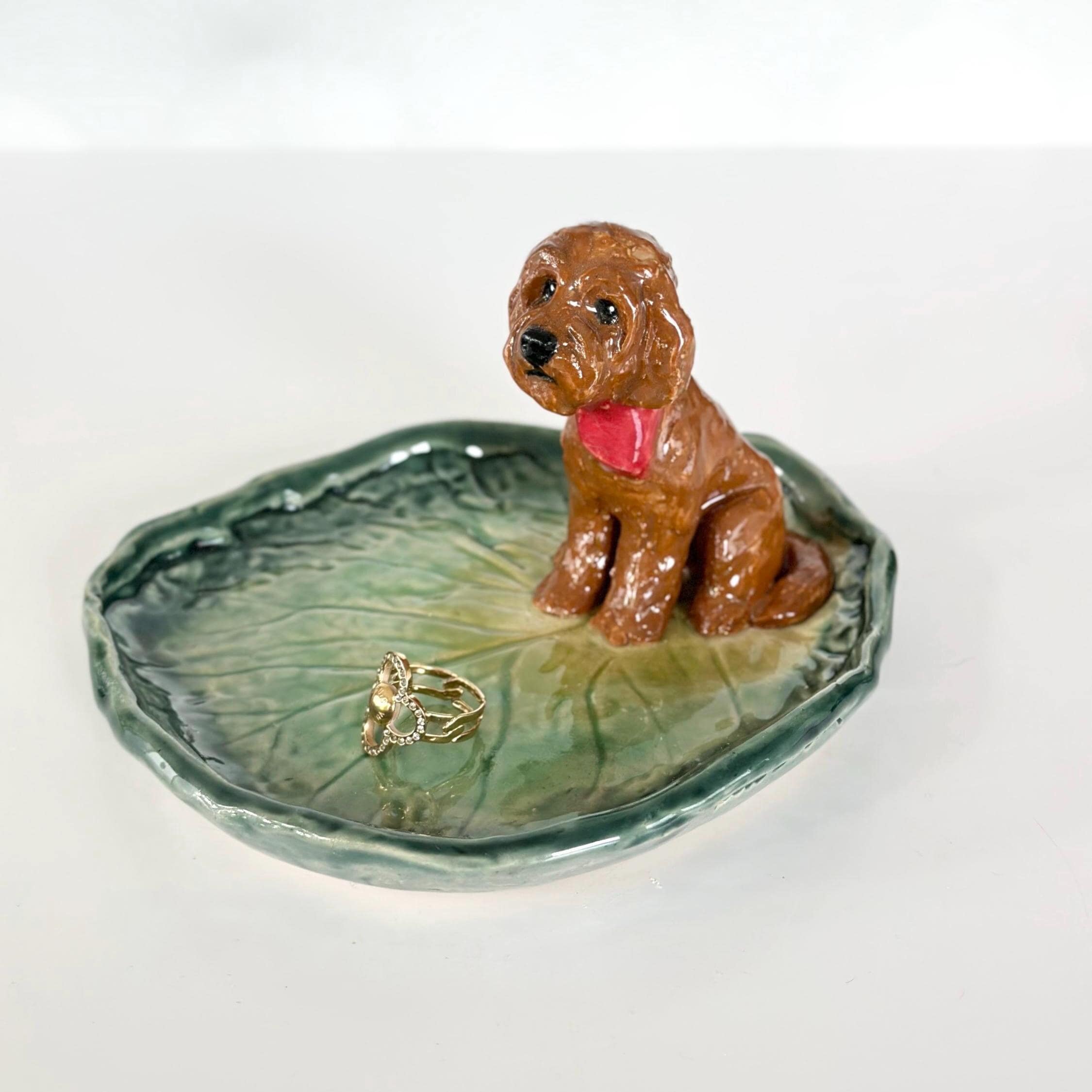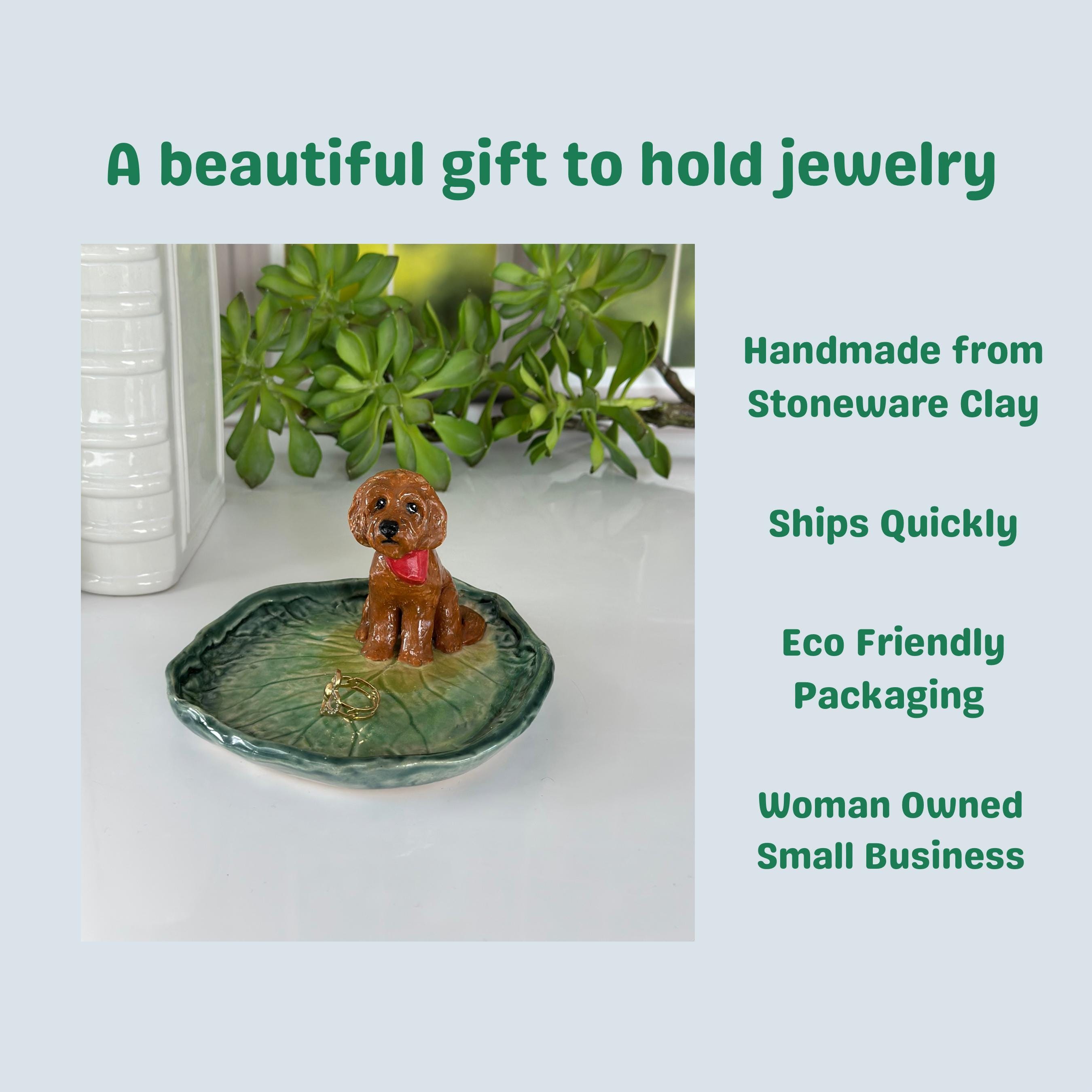 Our hand sculpted ceramic Doodle ring dish is such a great gift for a dog mom. sitting on a clay leaf ready to hold rings, necklaces or any jewelry you want to keep in a safe place.