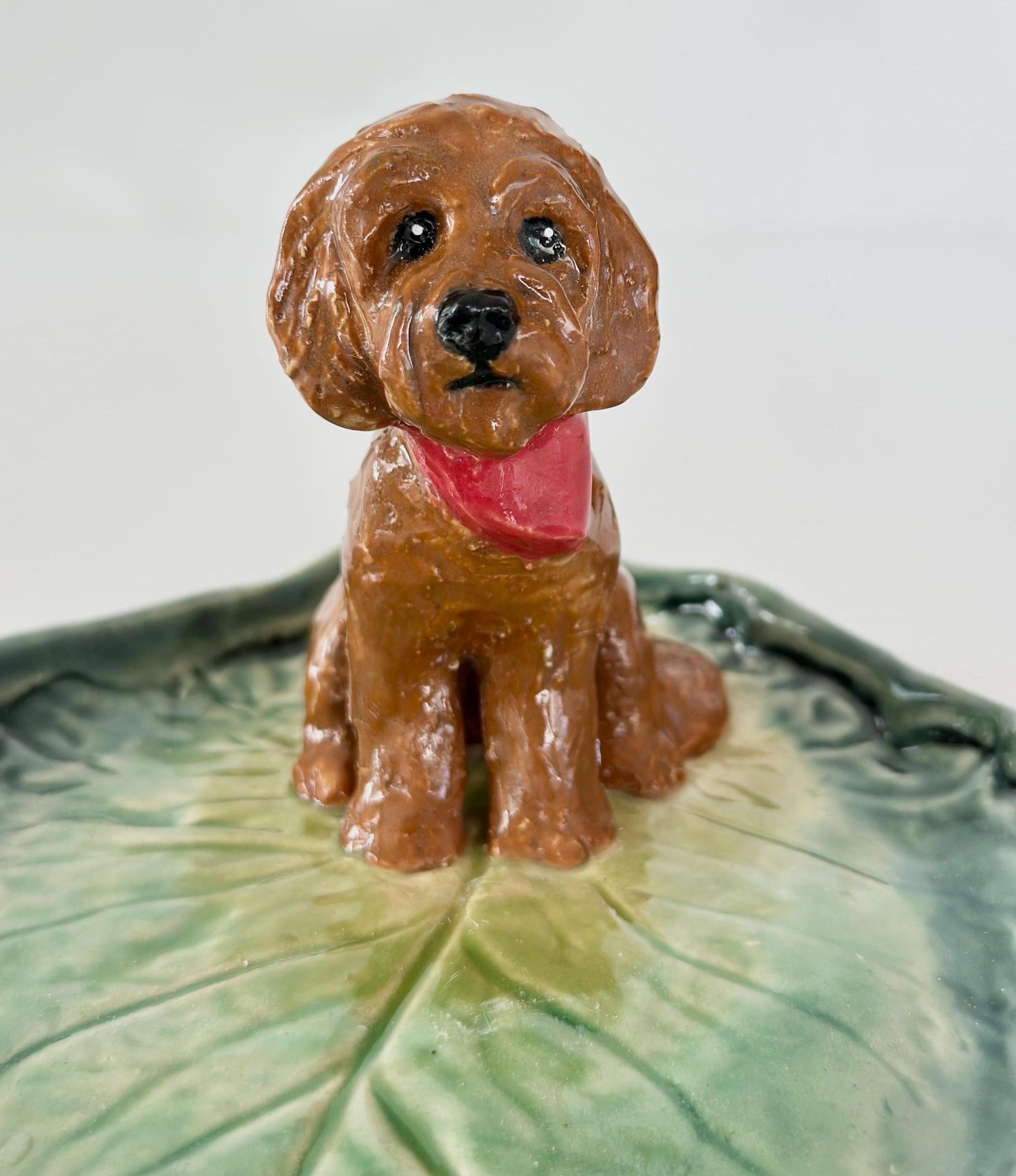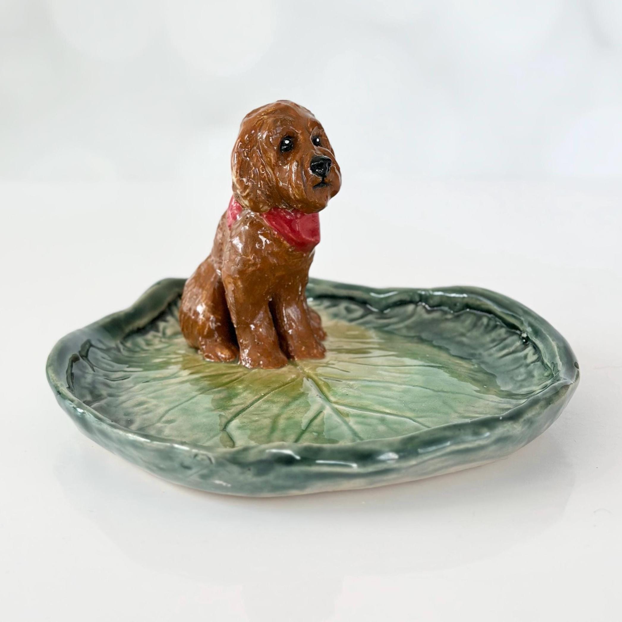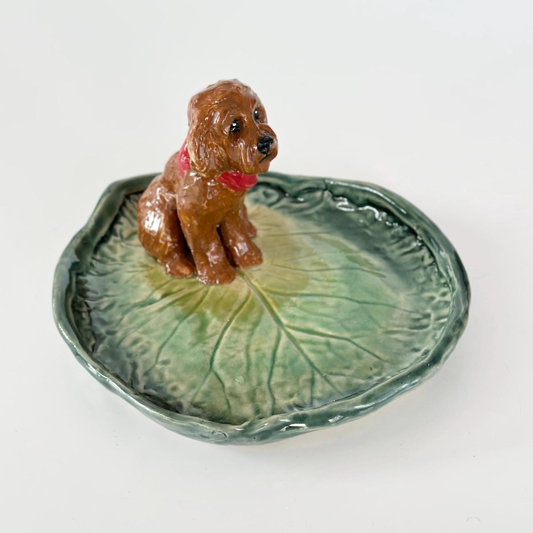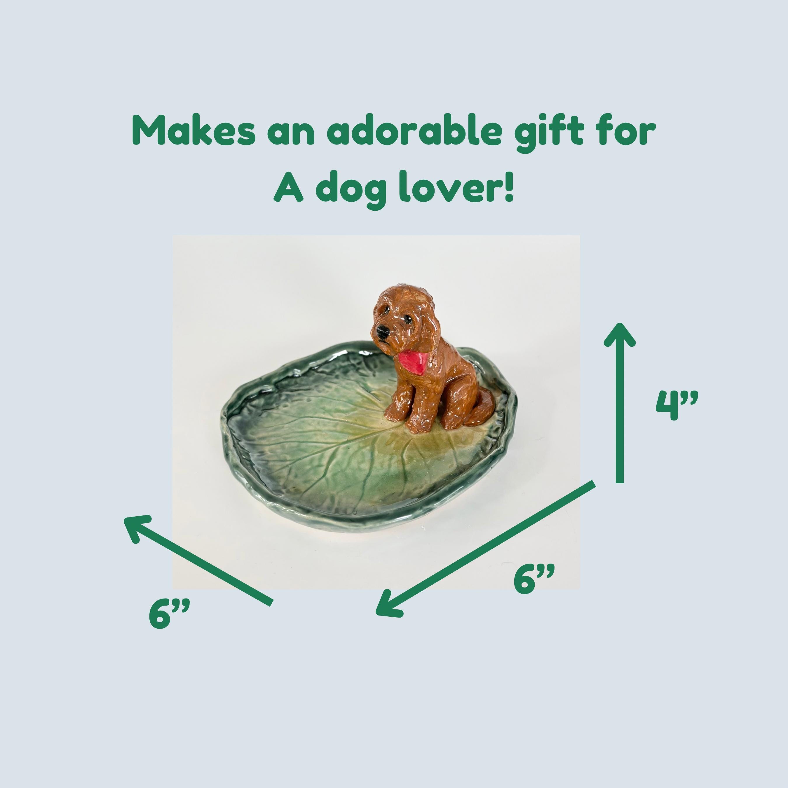 Our hand sculpted ceramic Doodle ring dish is such a great gift for a dog mom. sitting on a clay leaf ready to hold rings, necklaces or any jewelry you want to keep in a safe place.