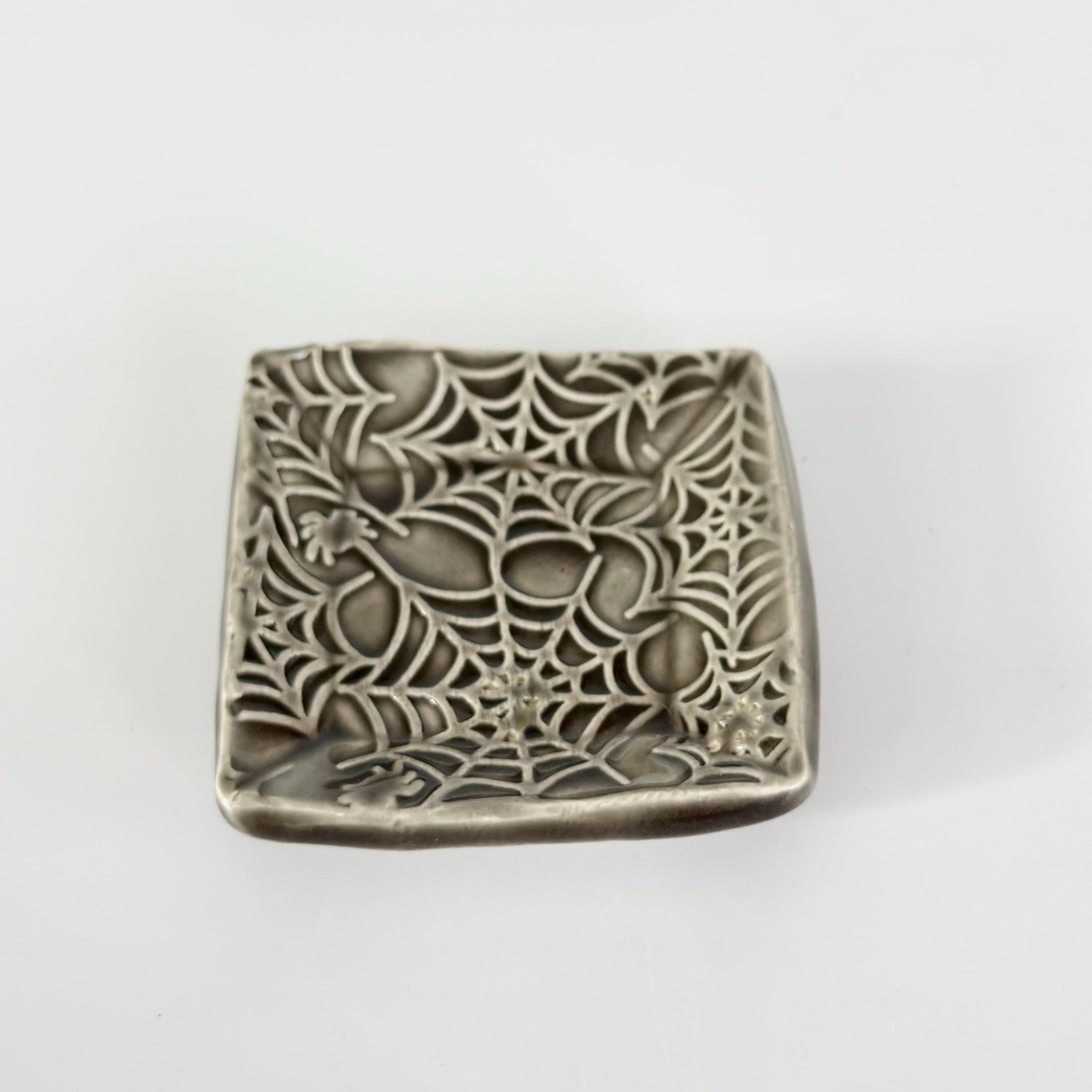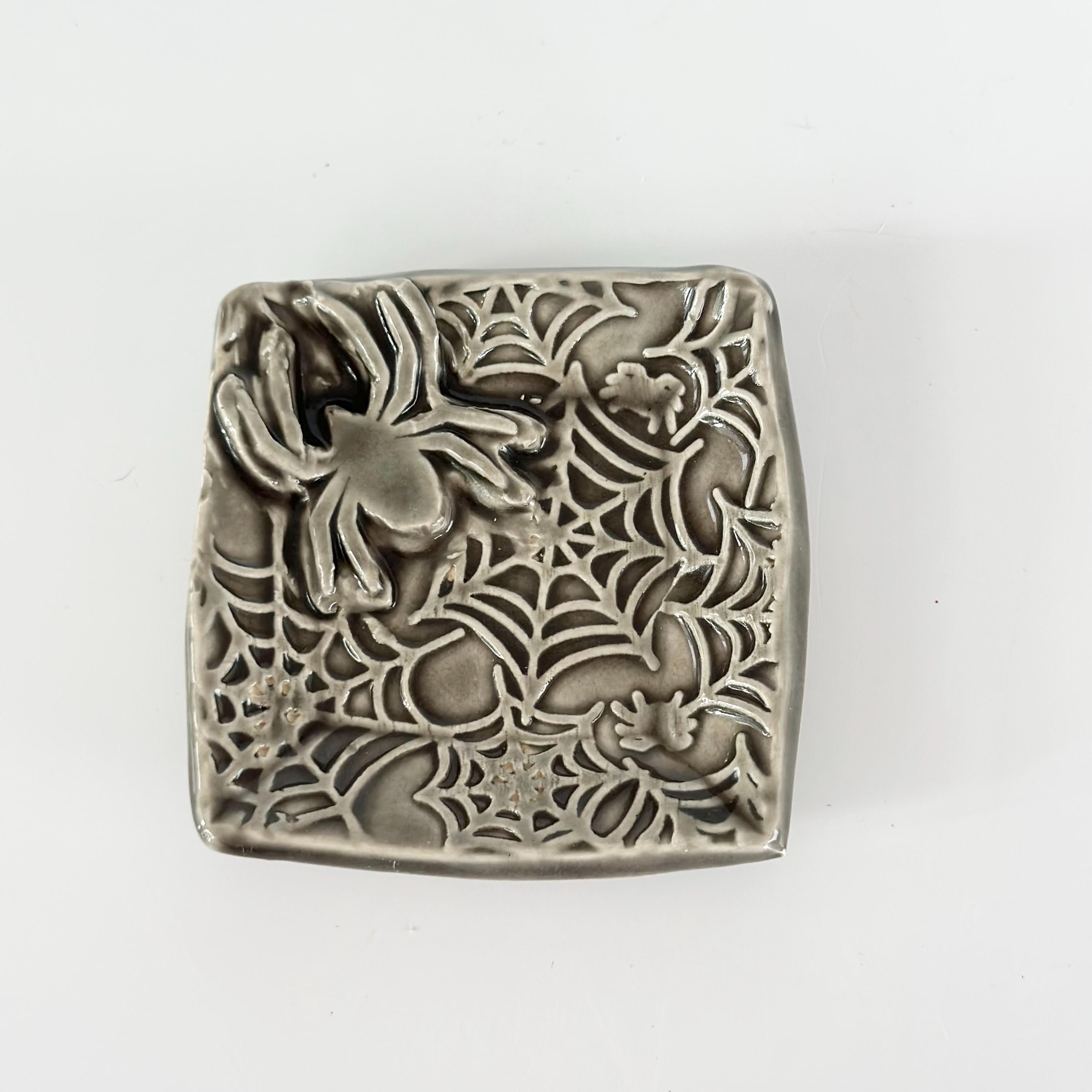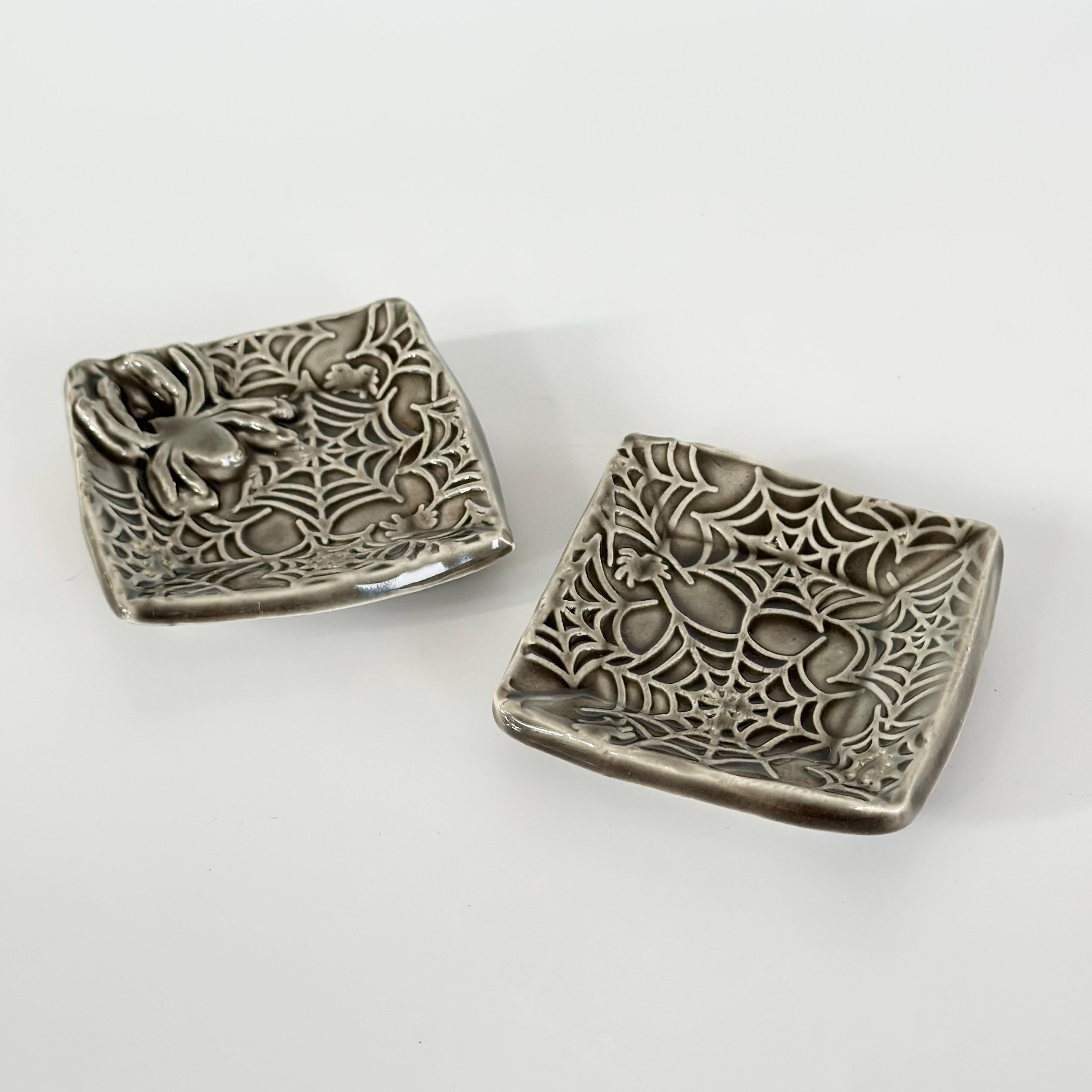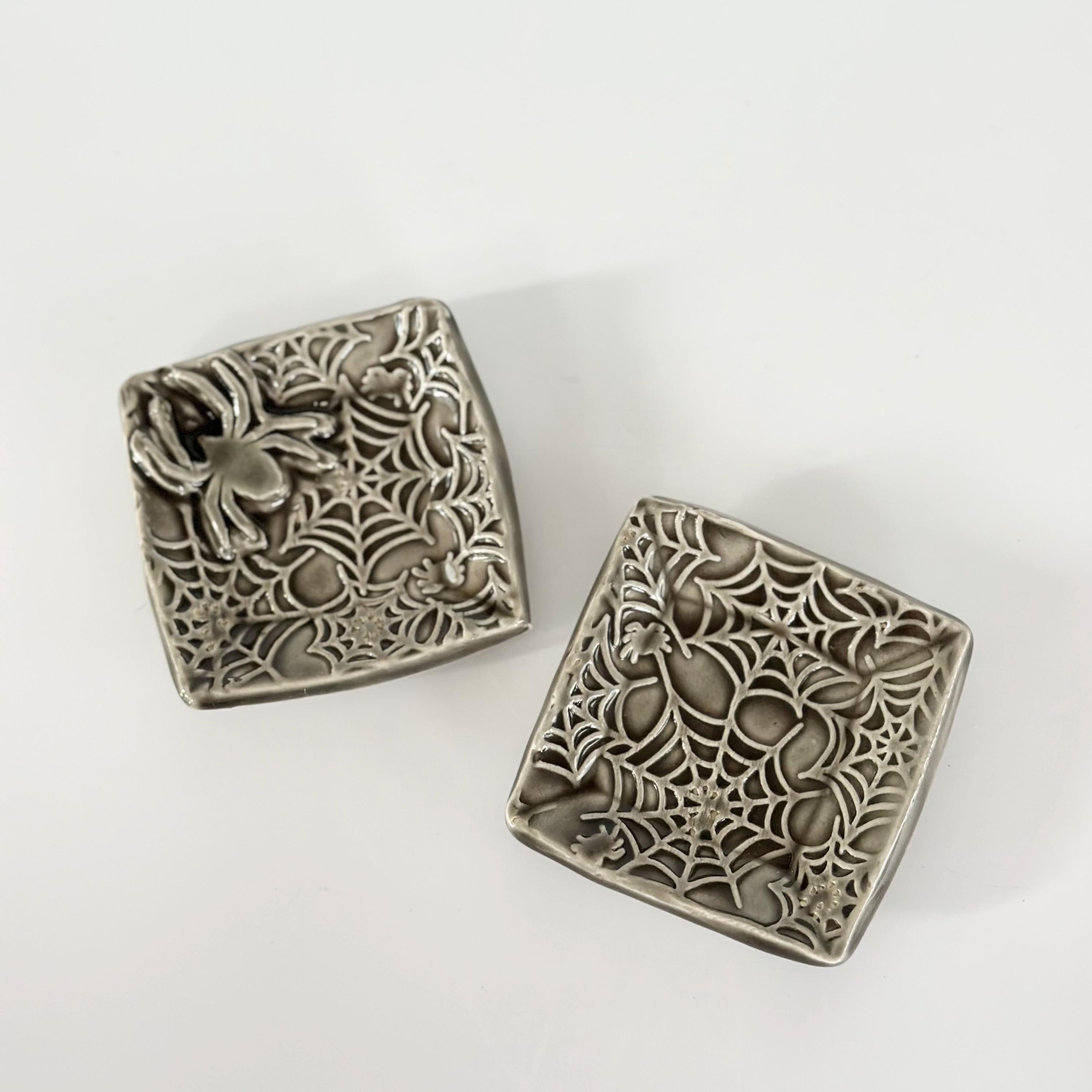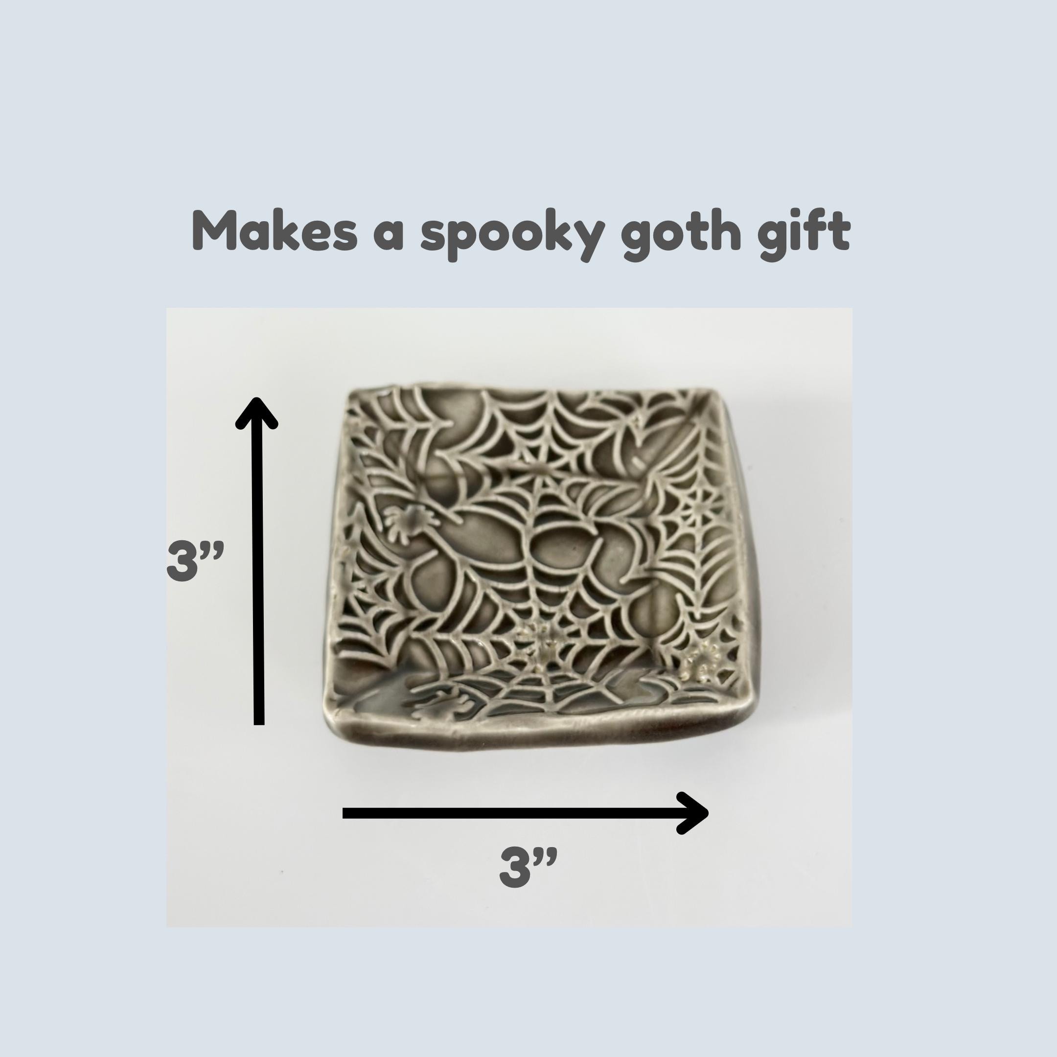 Our spider and spider web spoon rests are perfect for a spooky halloween home coffee bar station. A ceramic spider teaspoon holder for goth kitchen decor or a goth coffee lover gift.