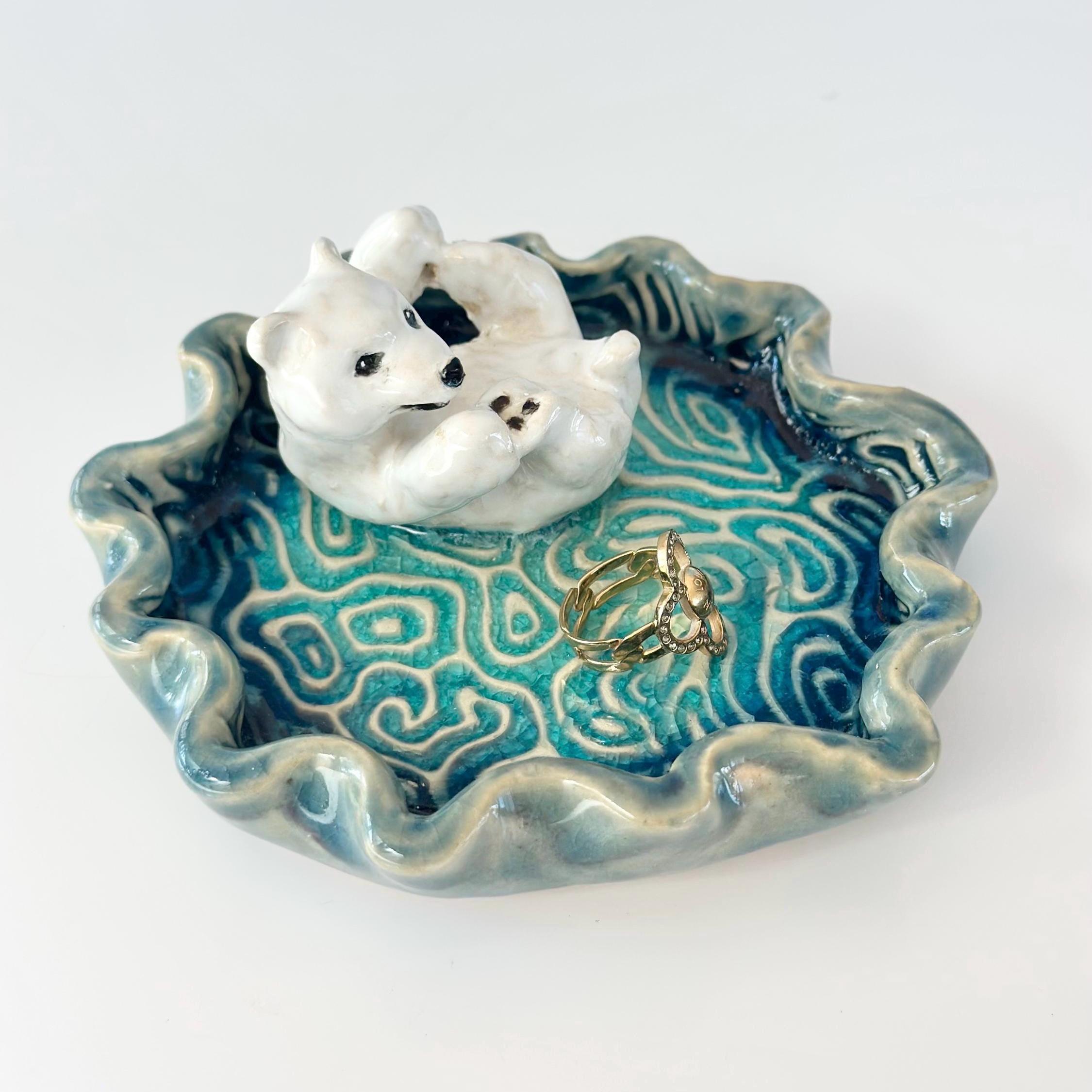 Our hand sculpted ceramic baby polar bear ring dish is such a great gift for a polar bear lover. Sitting on icy waters ready to hold rings, necklaces or any jewelry you want to keep in a safe place.