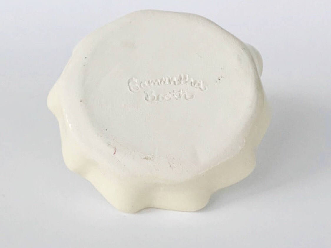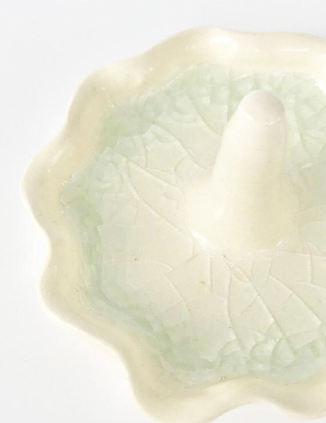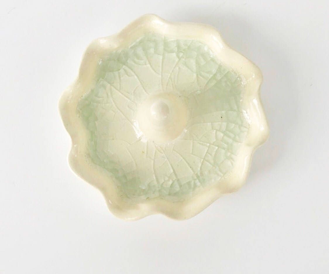 A pretty, handmade, scalloped ring holder with glass melted into the dish. A process that takes three firings.