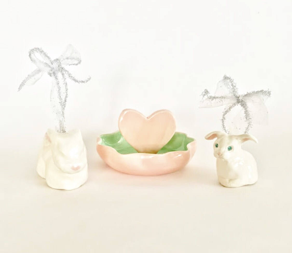All custom jewelry dishes with satin bows and/or vinyl personalization must only be wiped with a dry cloth. No dishwasher, no microwave, no oven and not for use with food.