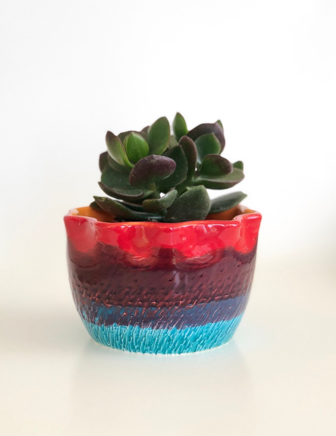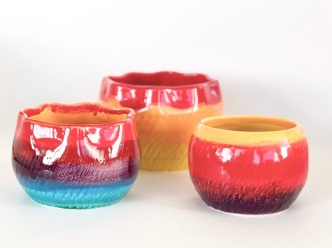 This is a small handmade ceramic pot which makes an adorable gift with a colorful cactus or succulent.
