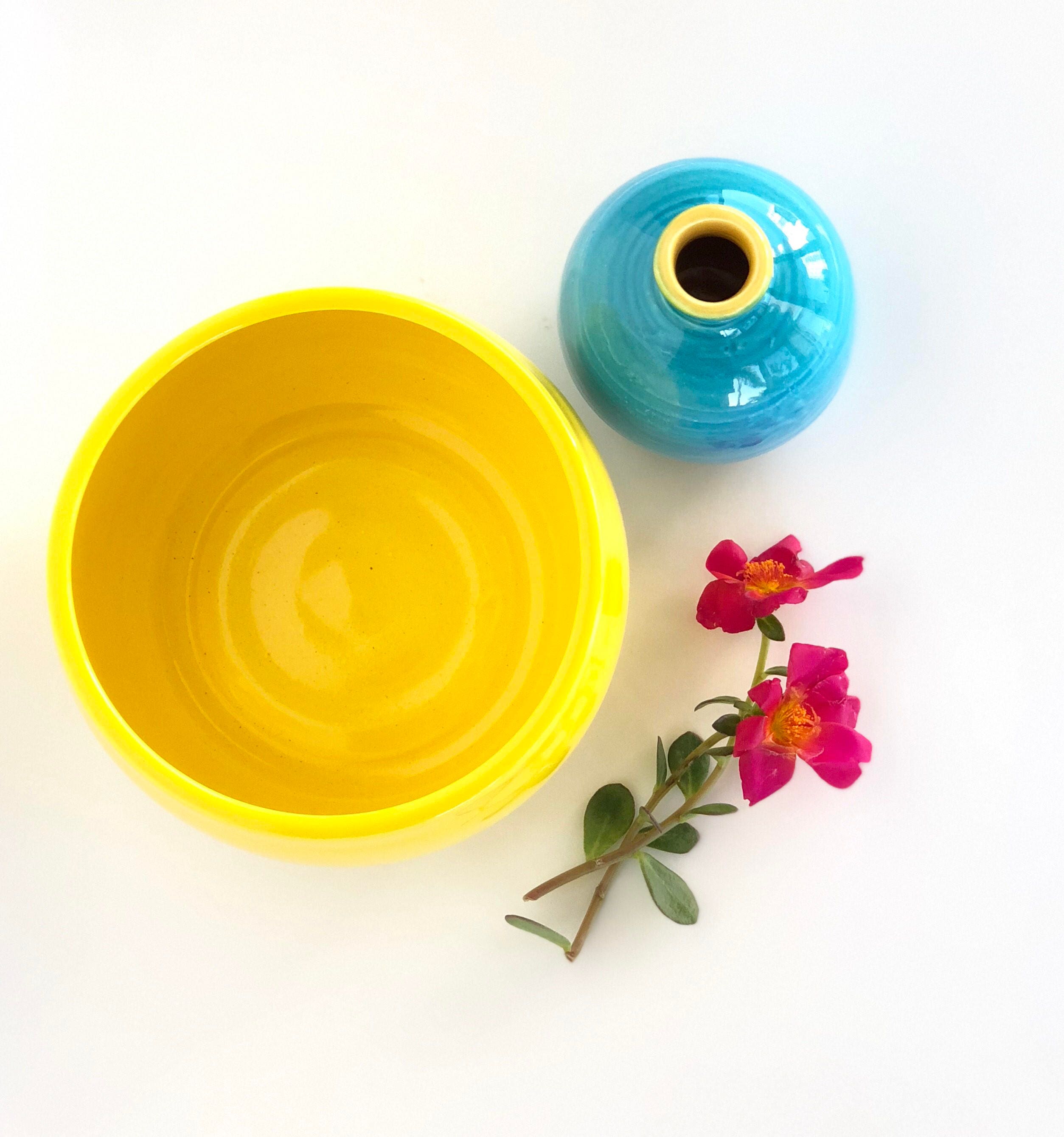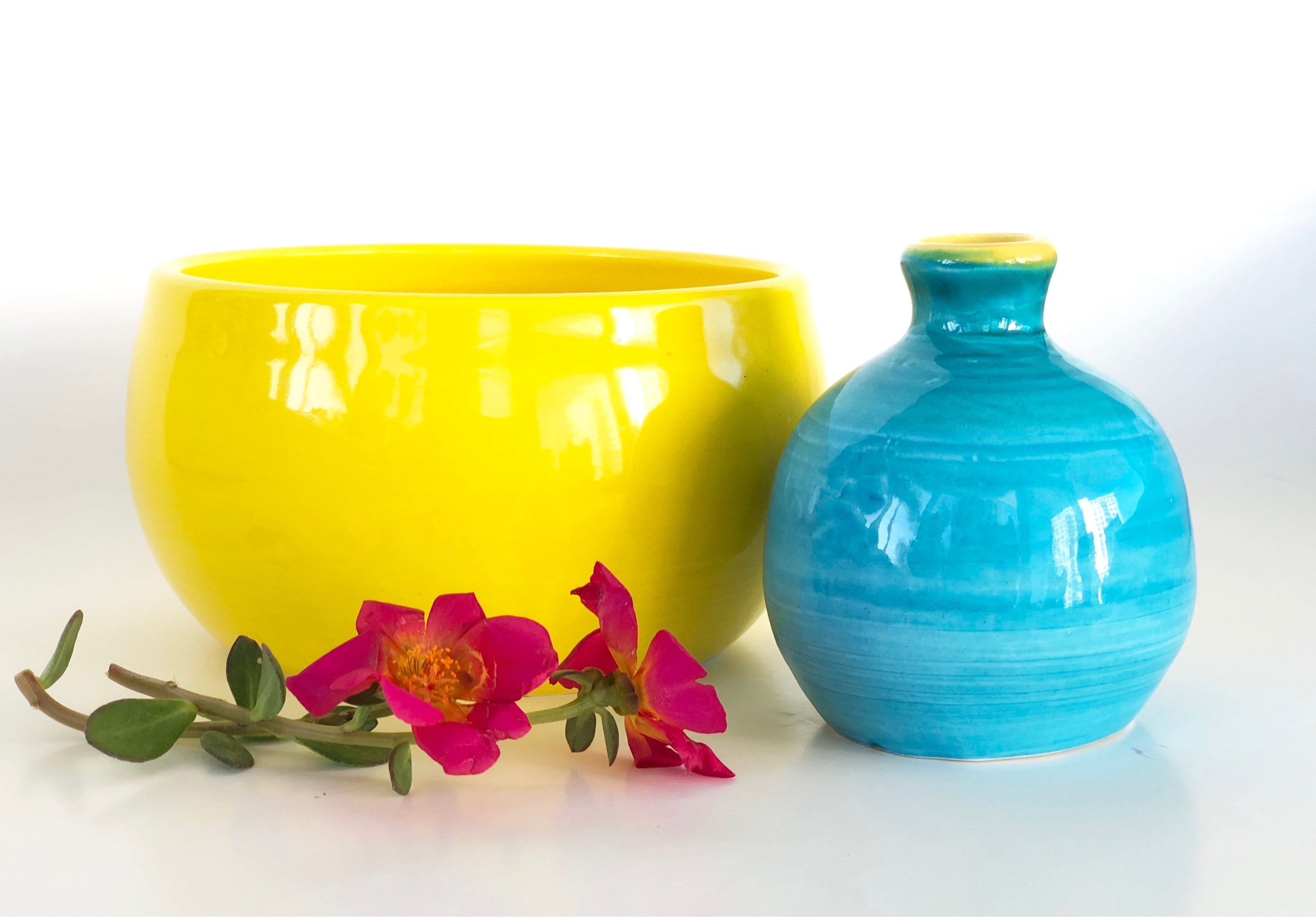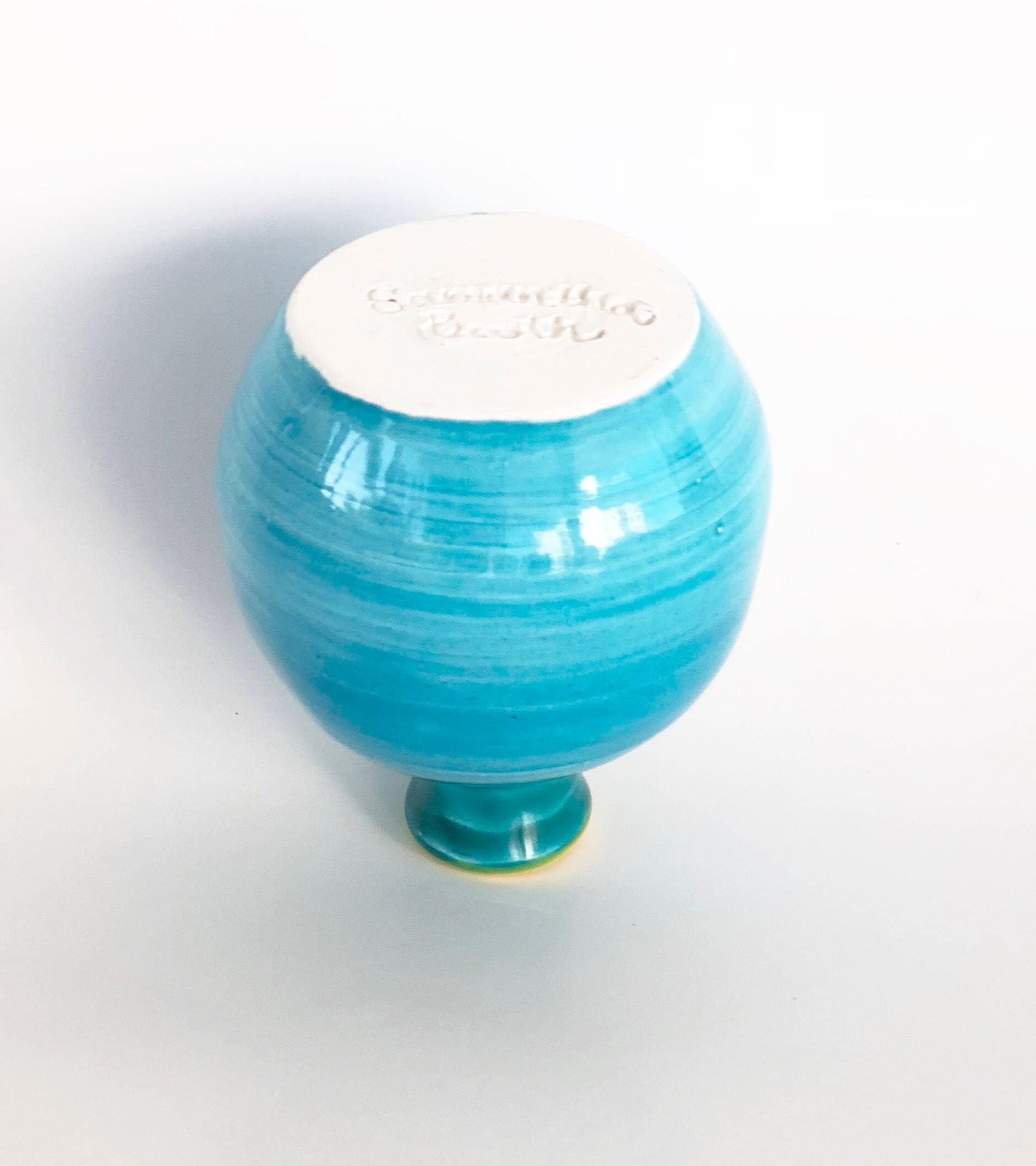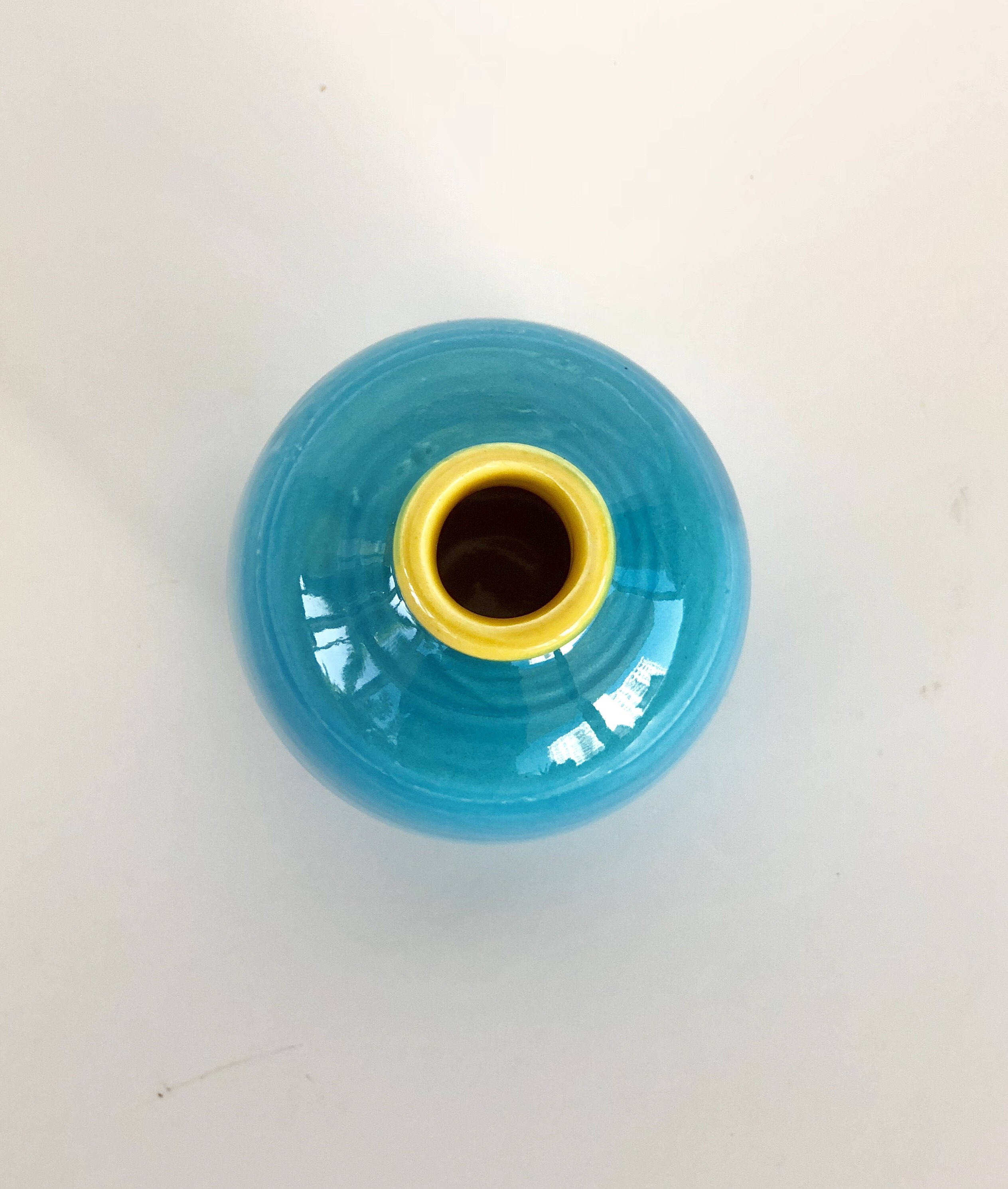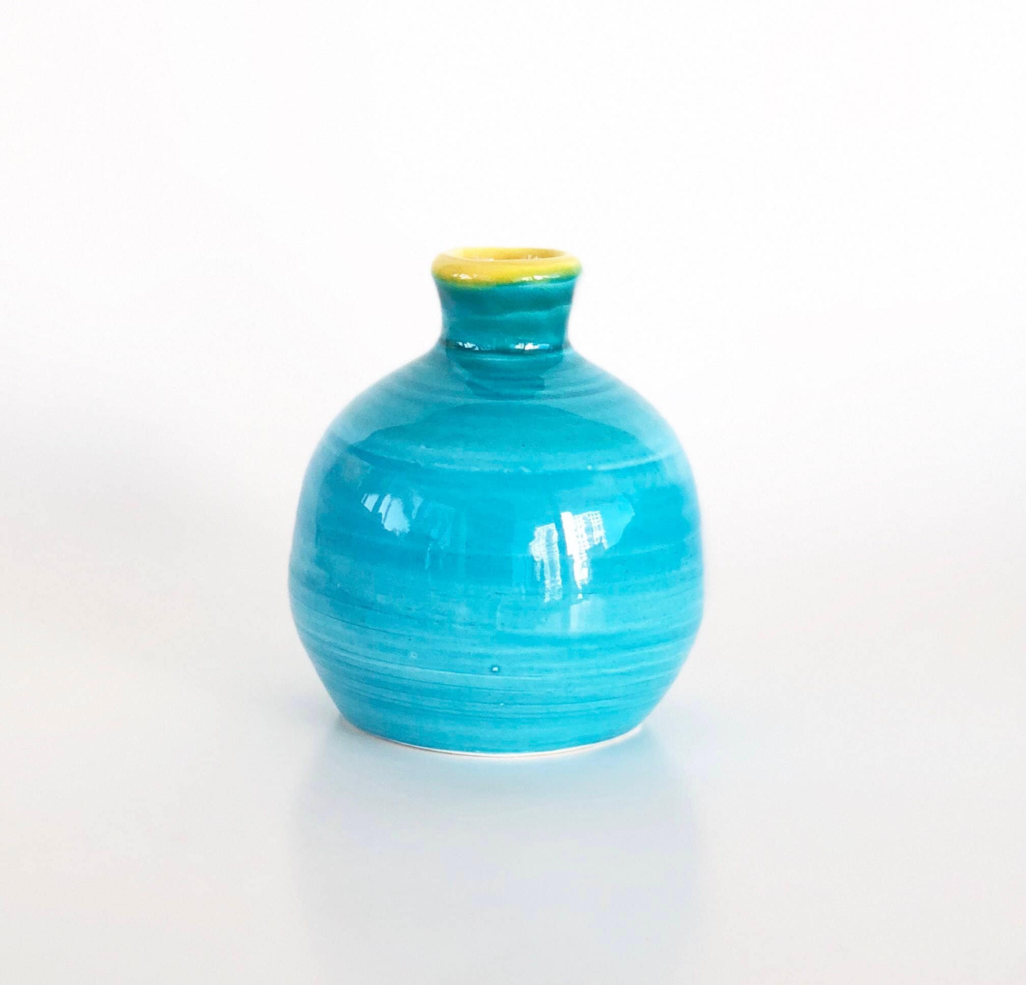 This mini wheel thrown blue and yellow vase looks beautiful alone on a windowsill or on a small table in groups of three or five.