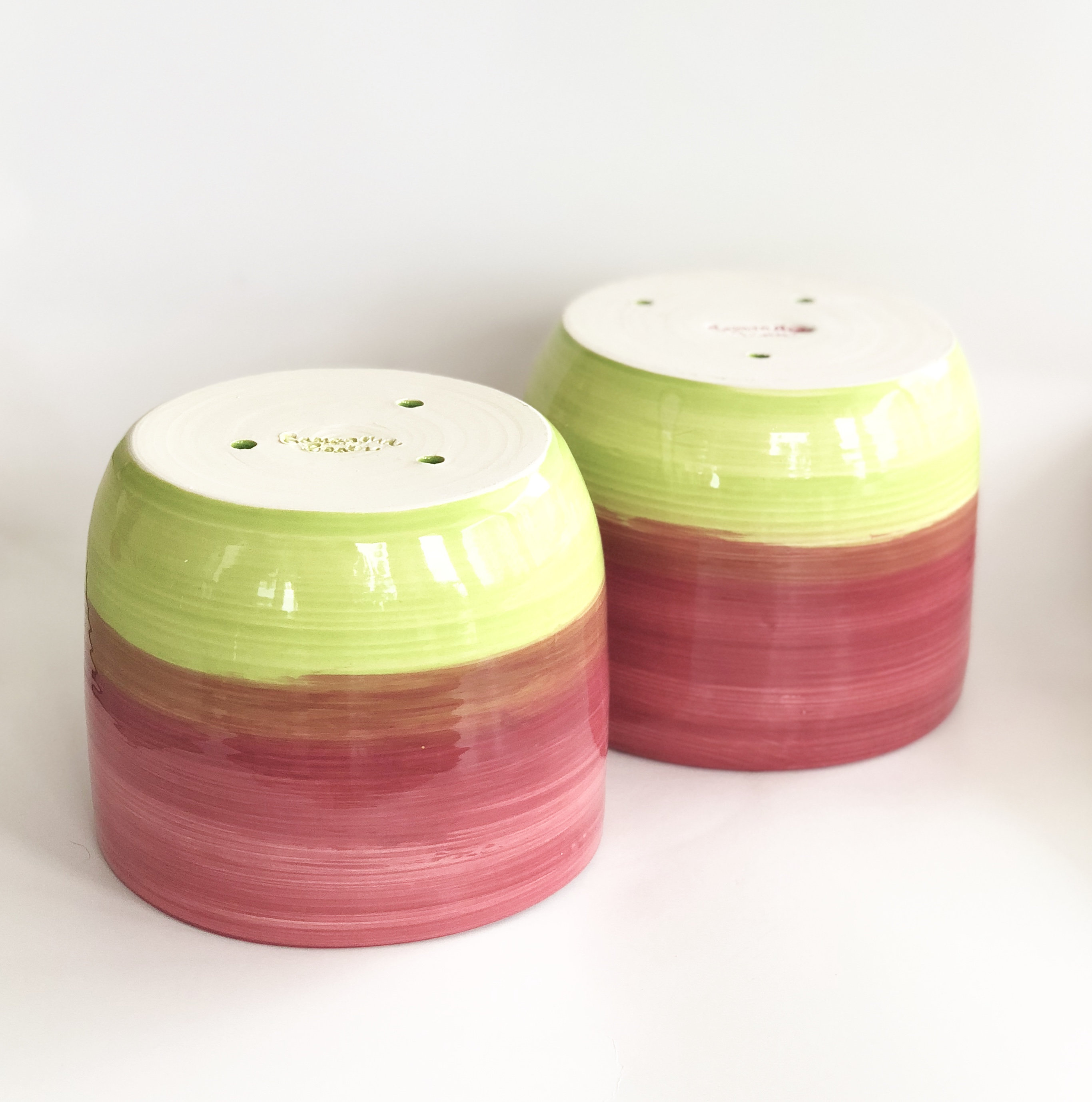 This is a handmade wheel thrown raspberry and lime green planter pot with holes.