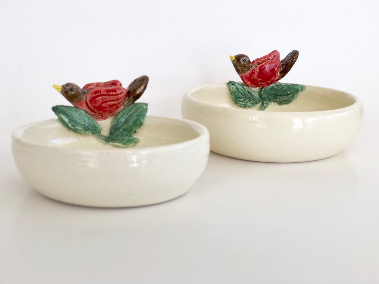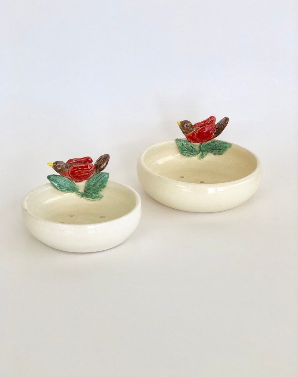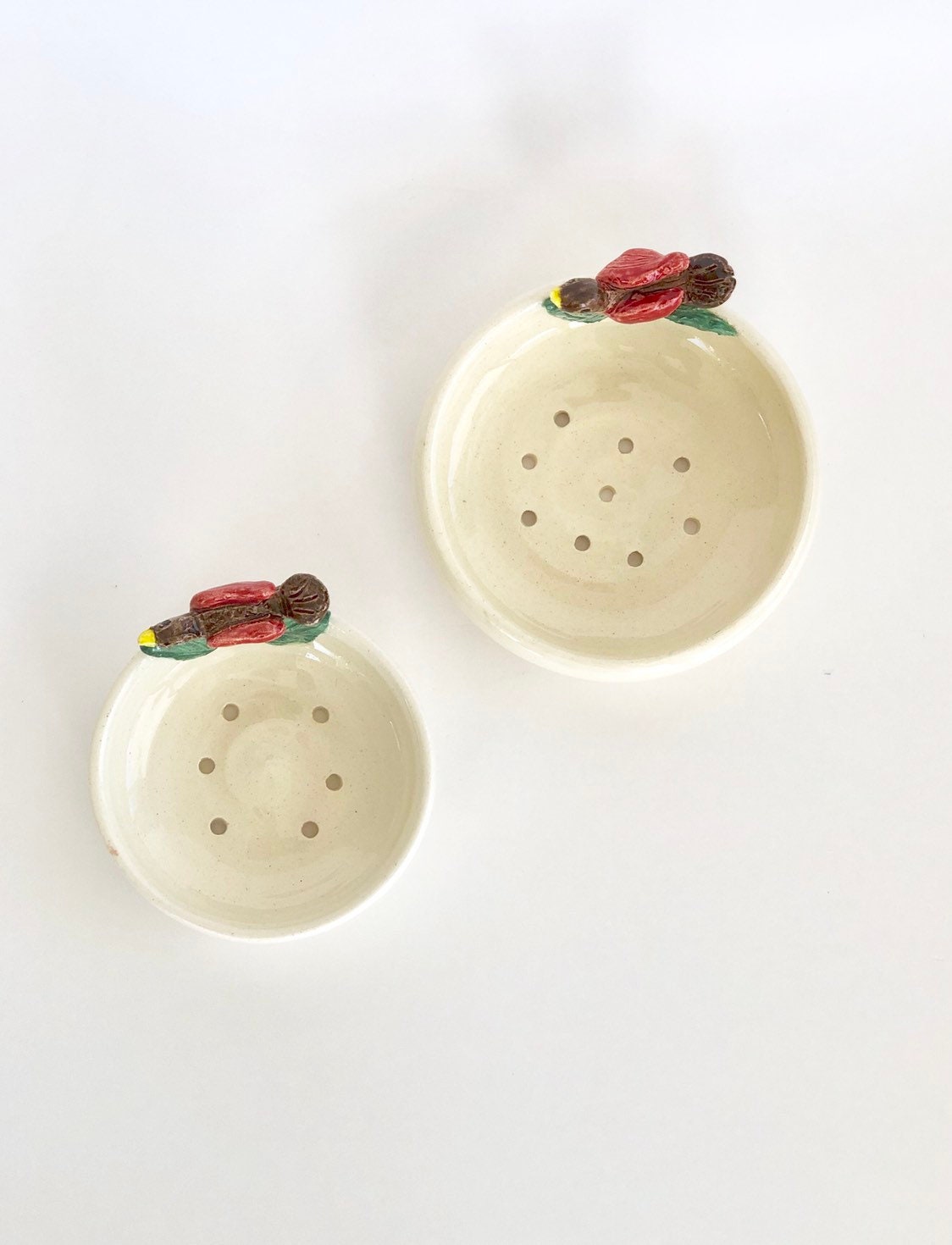 This is an original, handmade bird perched on a handmade soap dish by NYC award winning artist Bebe Booth.