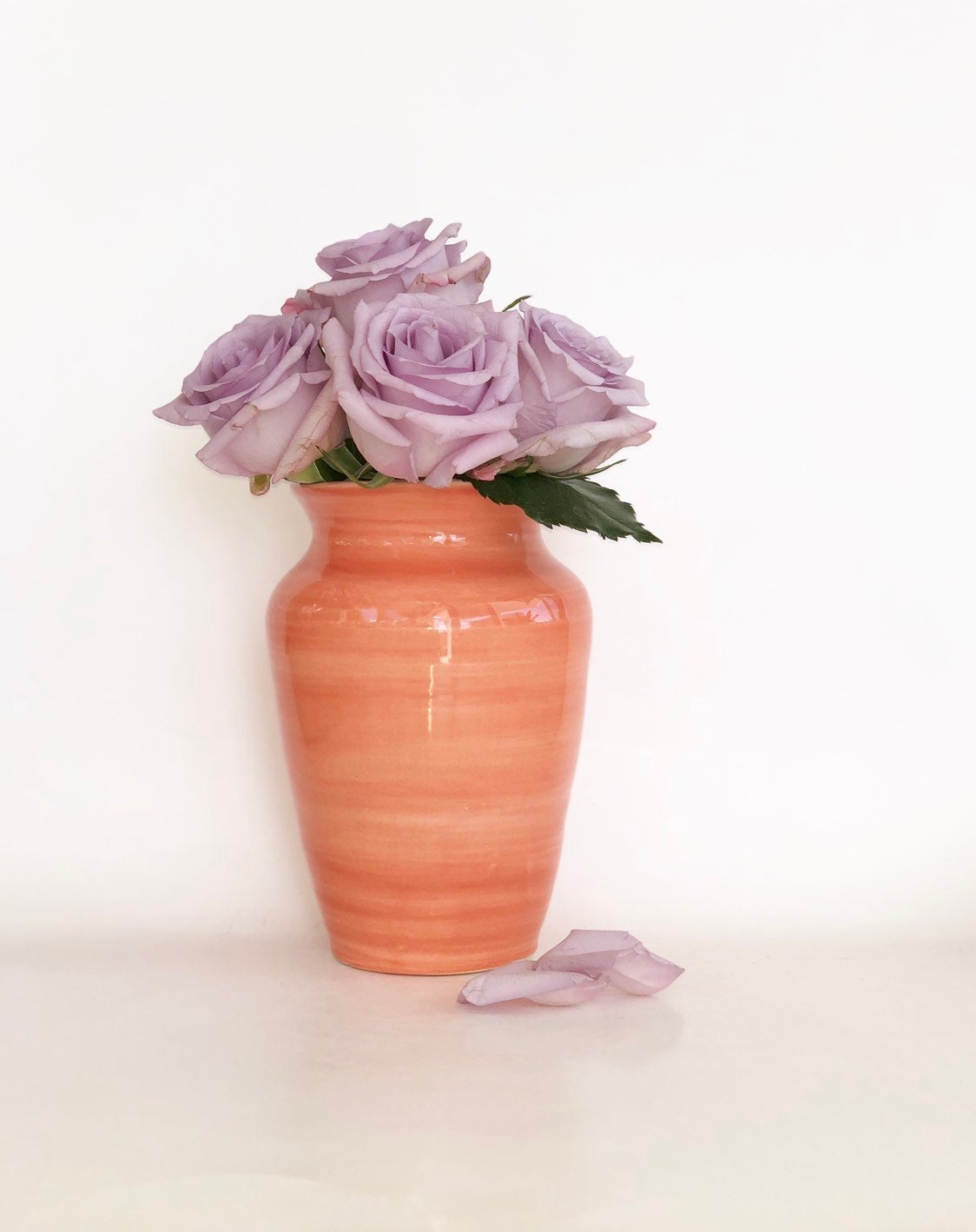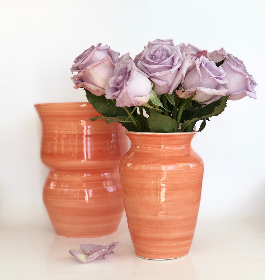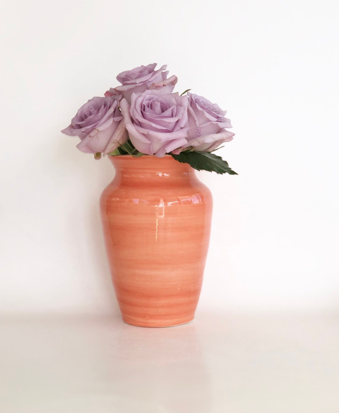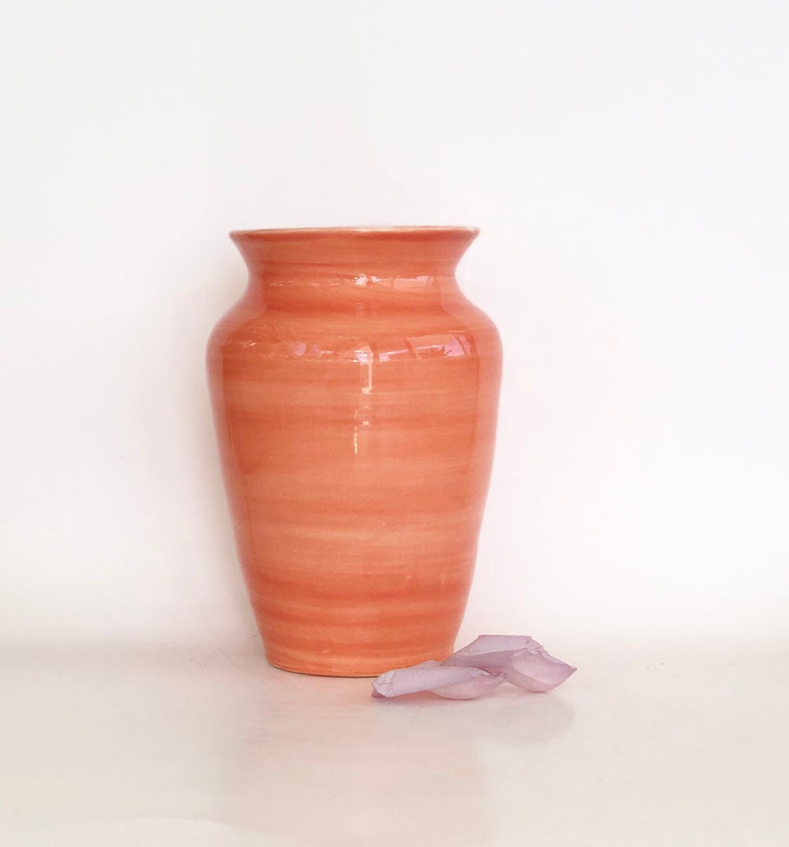 This is a glossy, cantaloupe glazed wheel thrown vase.
