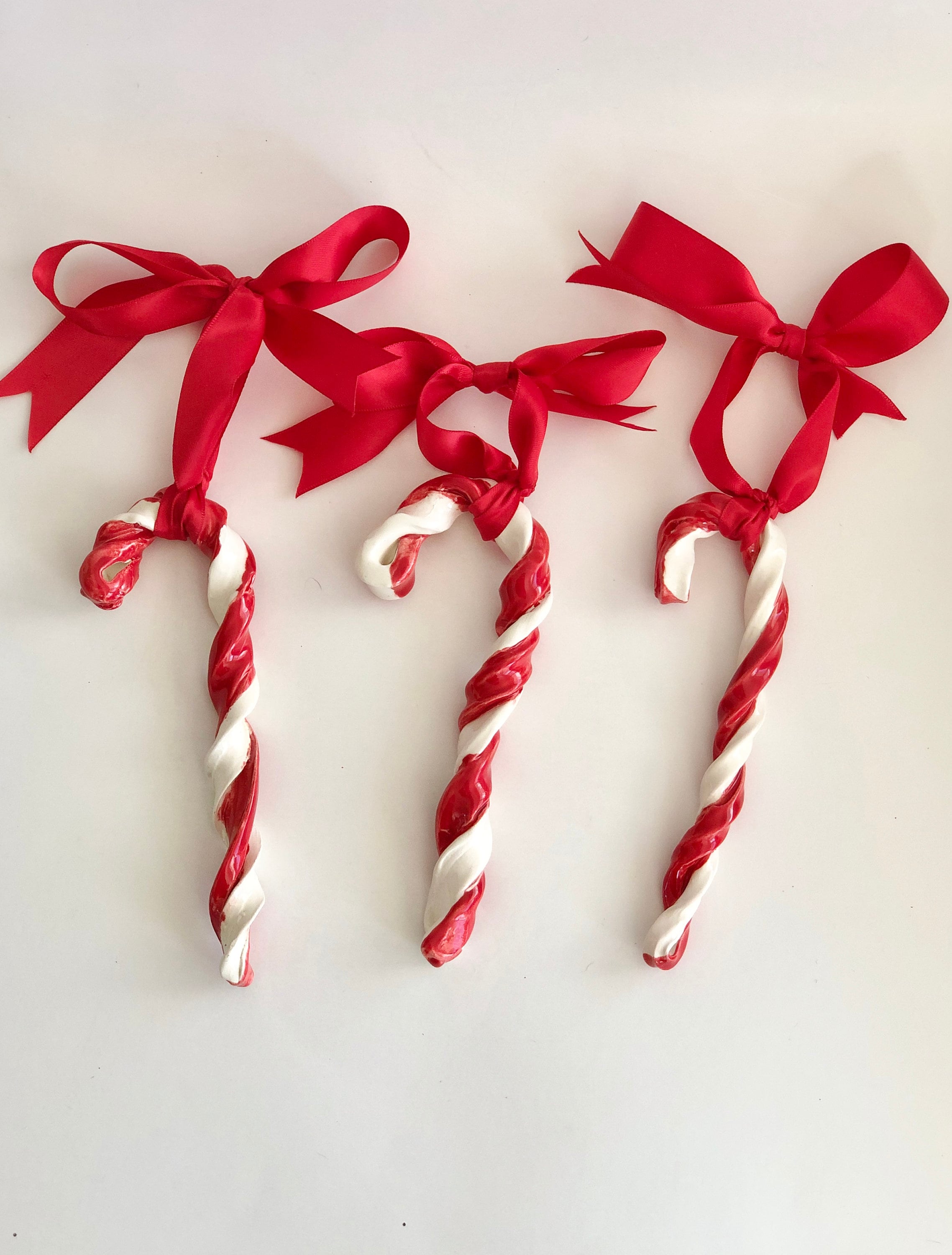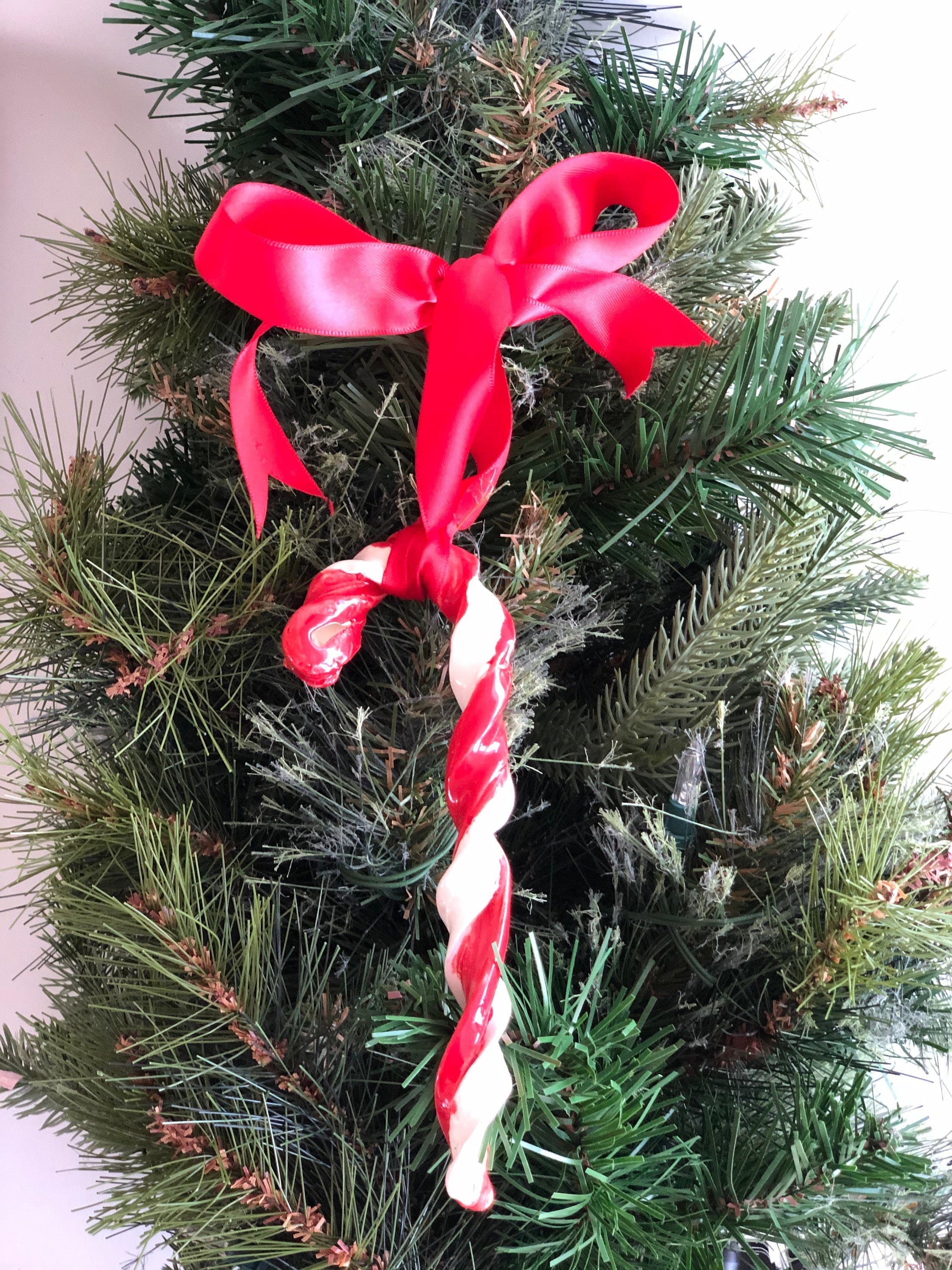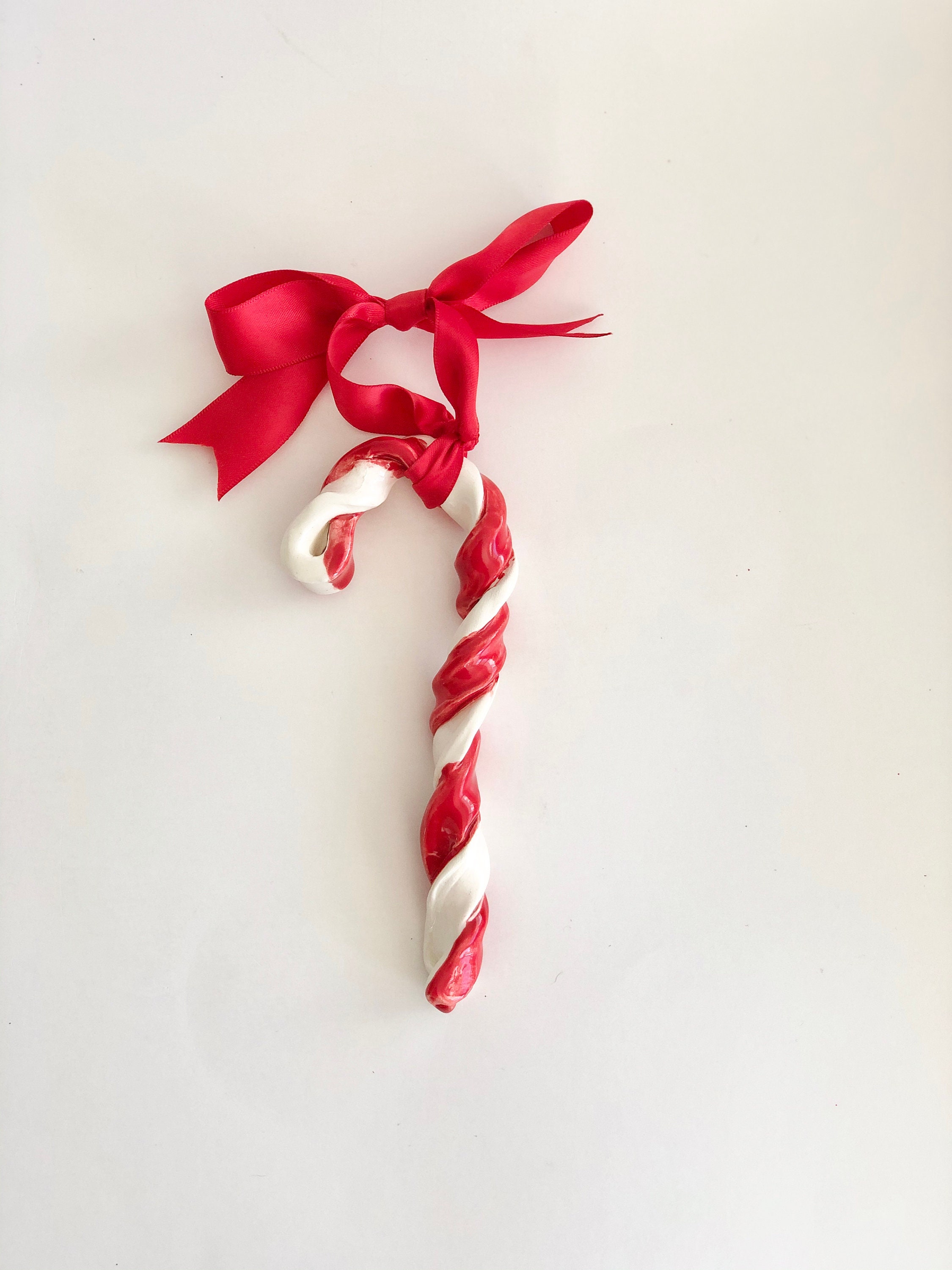 This is a super pretty, glossy candy cane ornament handmade and hand glazed.