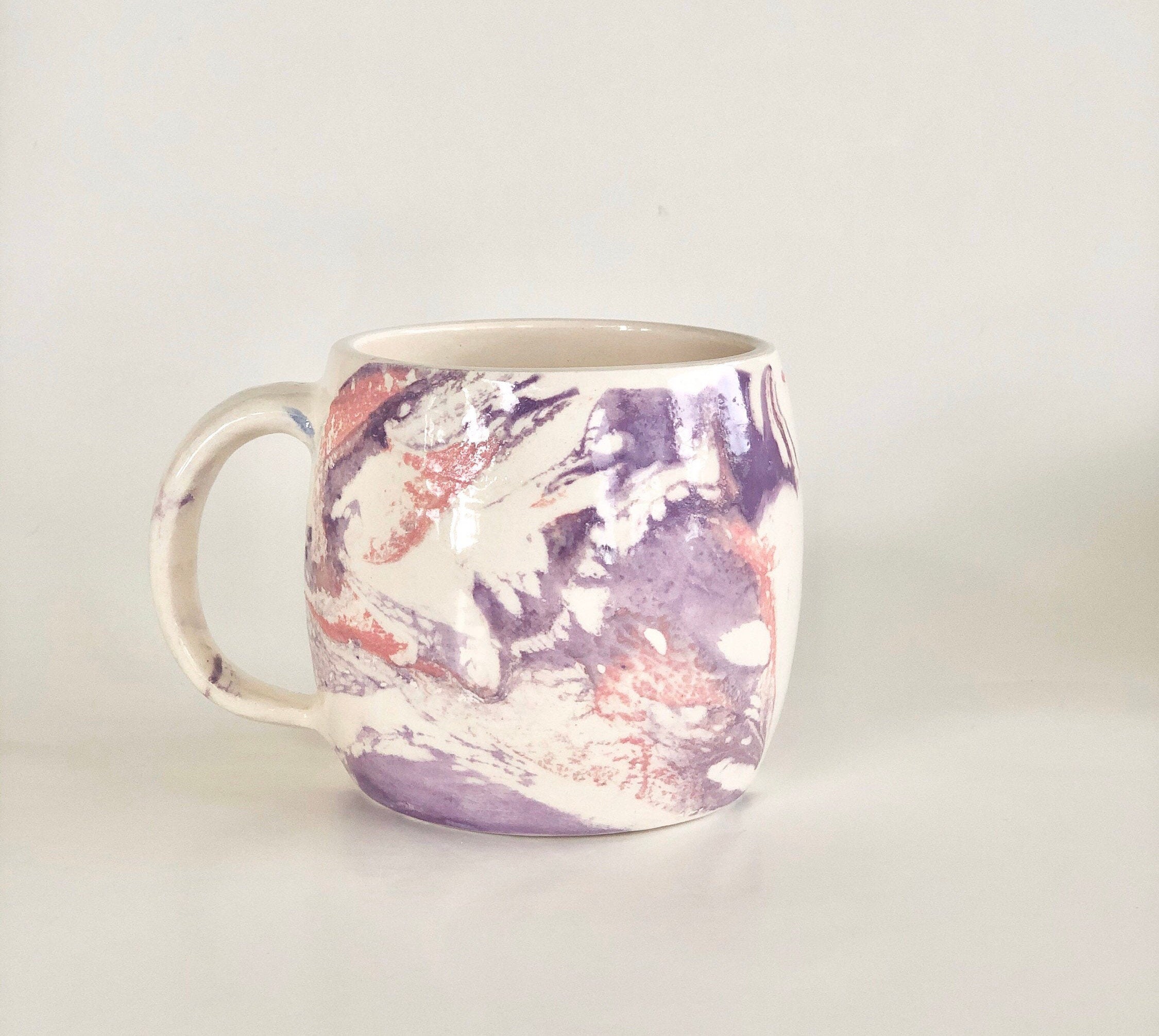 Our handmade mug in pink and purple is one of a kind and made on the potter’s wheel.