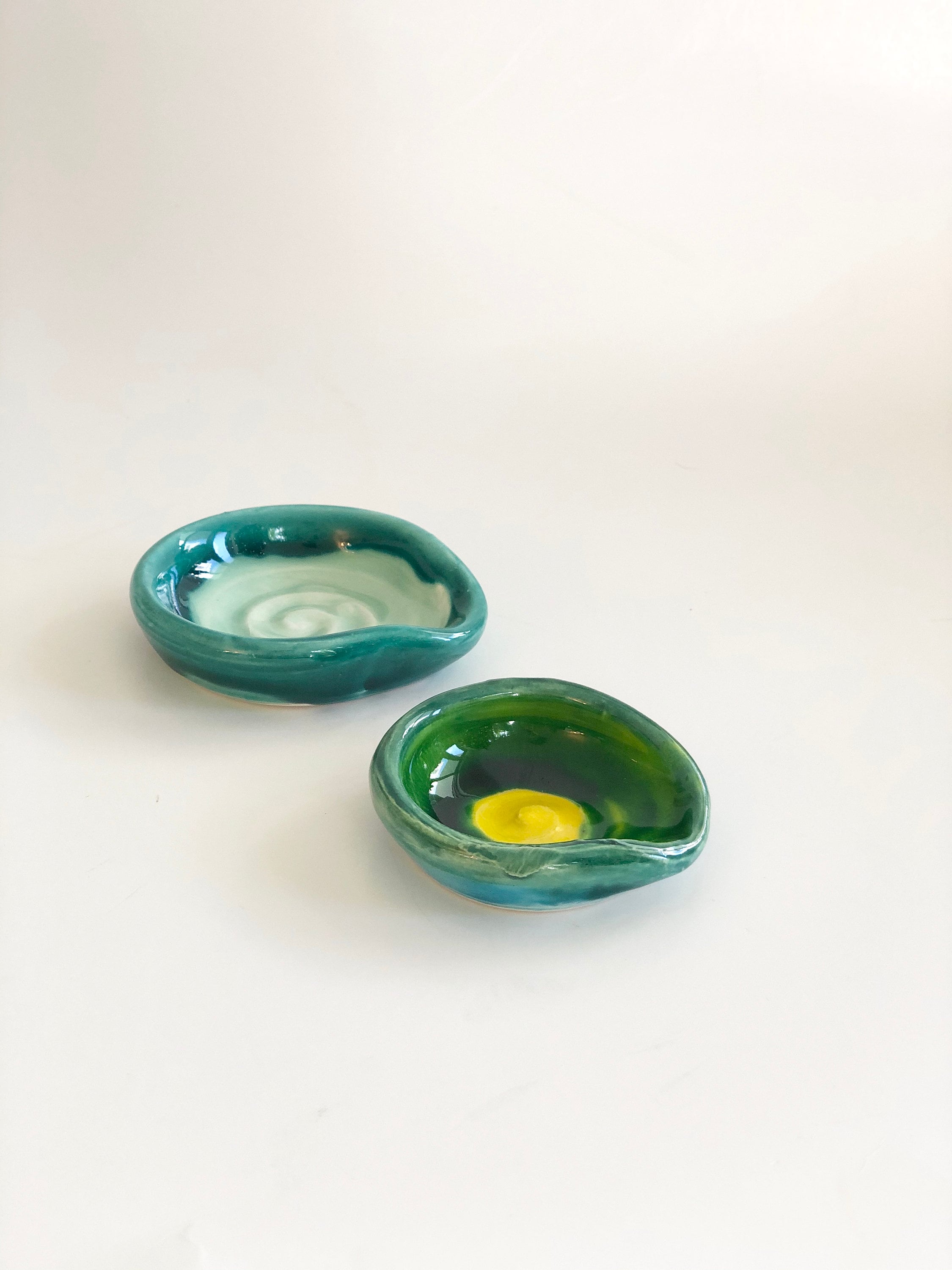 A dark green and yellow glazed ceramic handmade teaspoon rest.