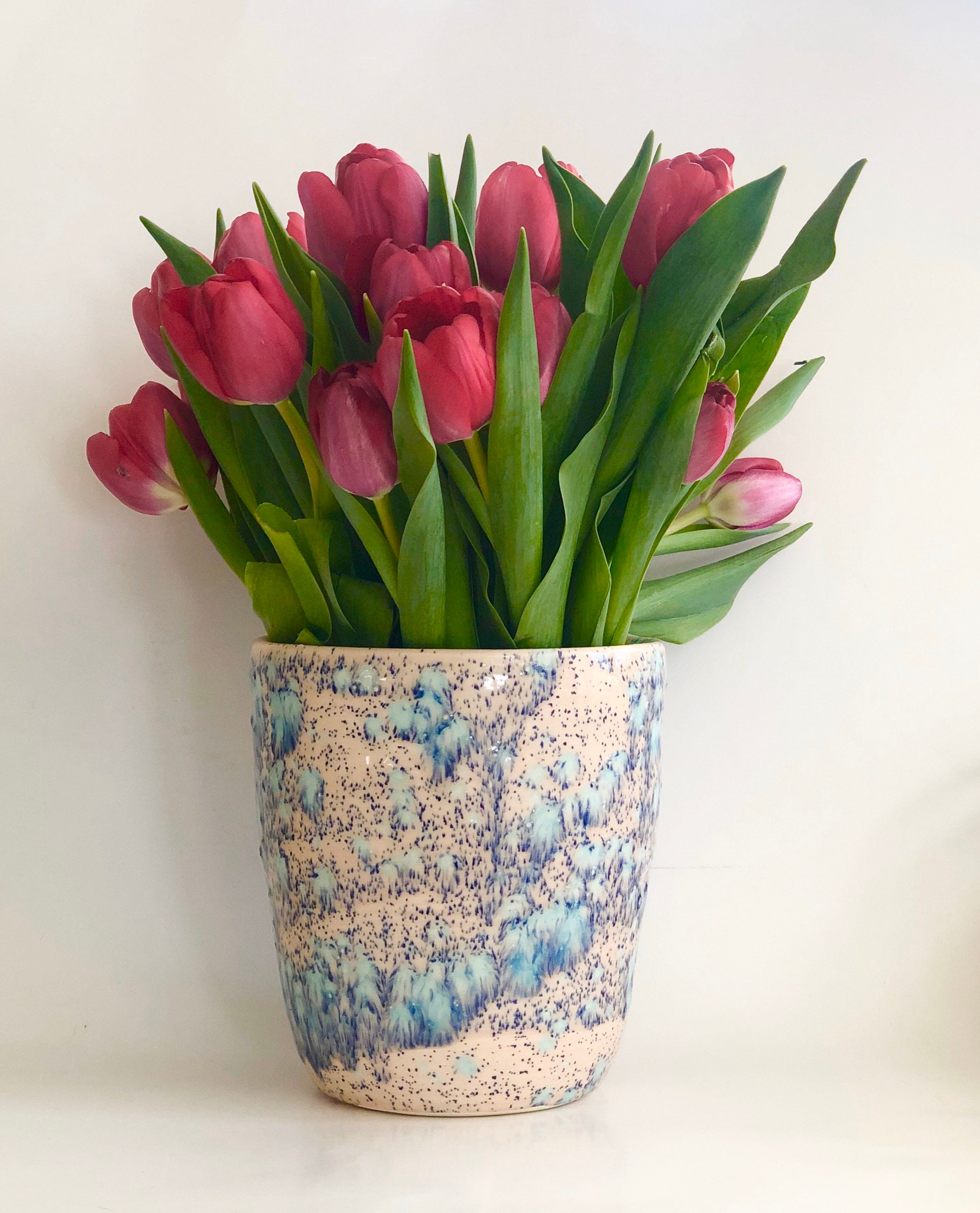 Makes a beautiful gift filled with flowers, or as a kitchen utensil holder or alone as a piece of artwork to display.